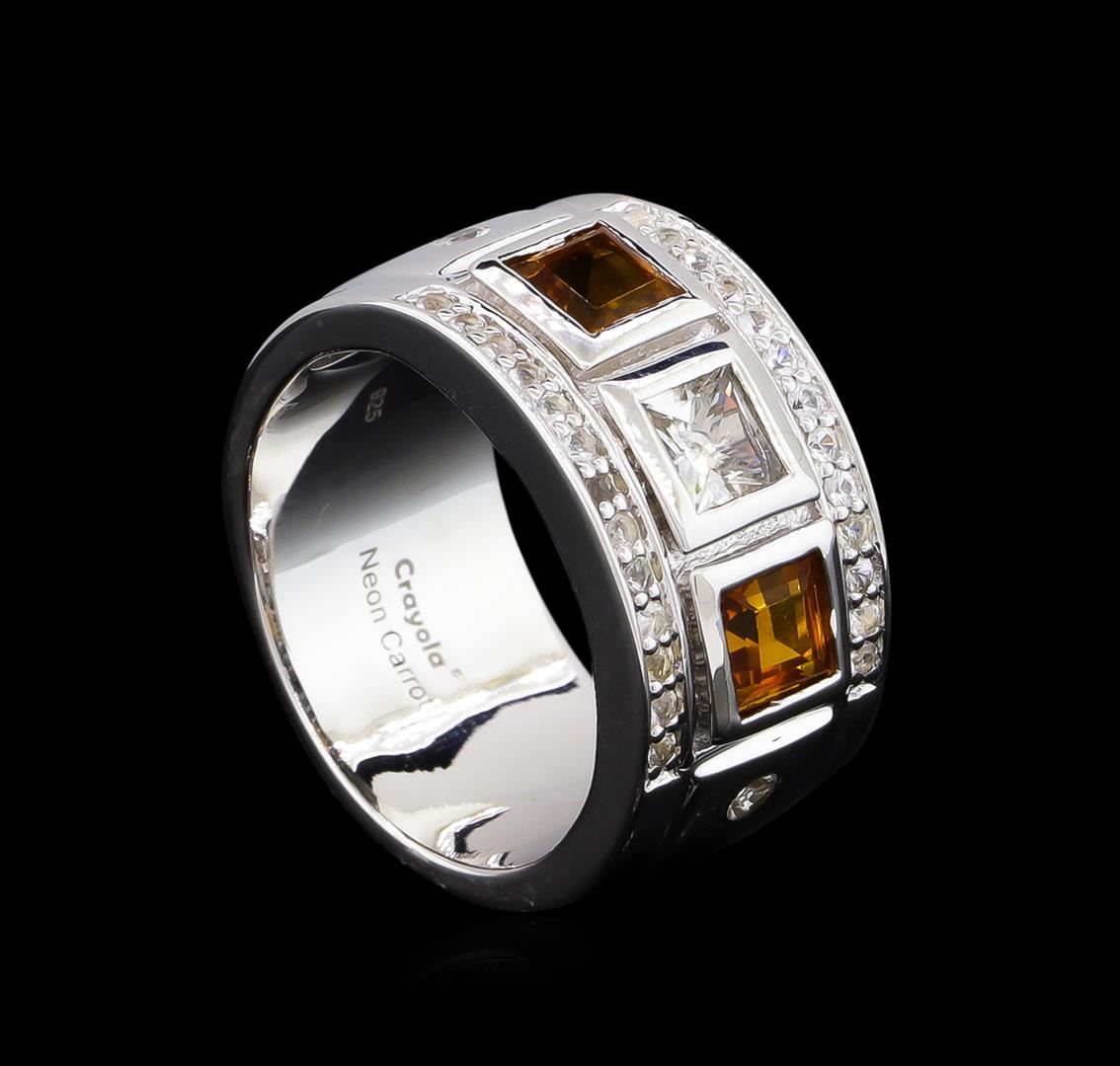 From the brand whose products have inspired creative expression for more than 110 years comes this beautiful ring by Crayola. This stunning piece of jewelry reflects the image and colorful personality of the Crayola brand. The ring features .925 Silver With Rhodium weighing 6.3 grams containing 9mm Pipe Cut Ring Neon Carrot Citrine (AAA) Square 4.00mm - 2Pcs + Natural White Sapphire Square (AAA) 4.00mm - 1 pc + Natural White Sapphire Round 2.00mm - 2Pcs + Natural White Sapphire Round 1.20mm - 24Pcs ( With J BACK ). Total Citrine weight is 0.54. Total white sapphire weight is approximately 0.66.