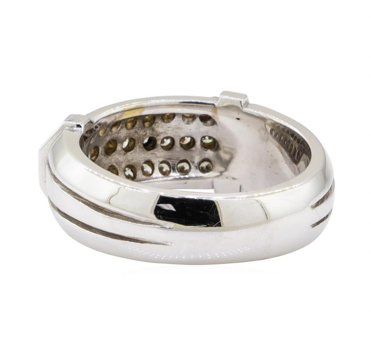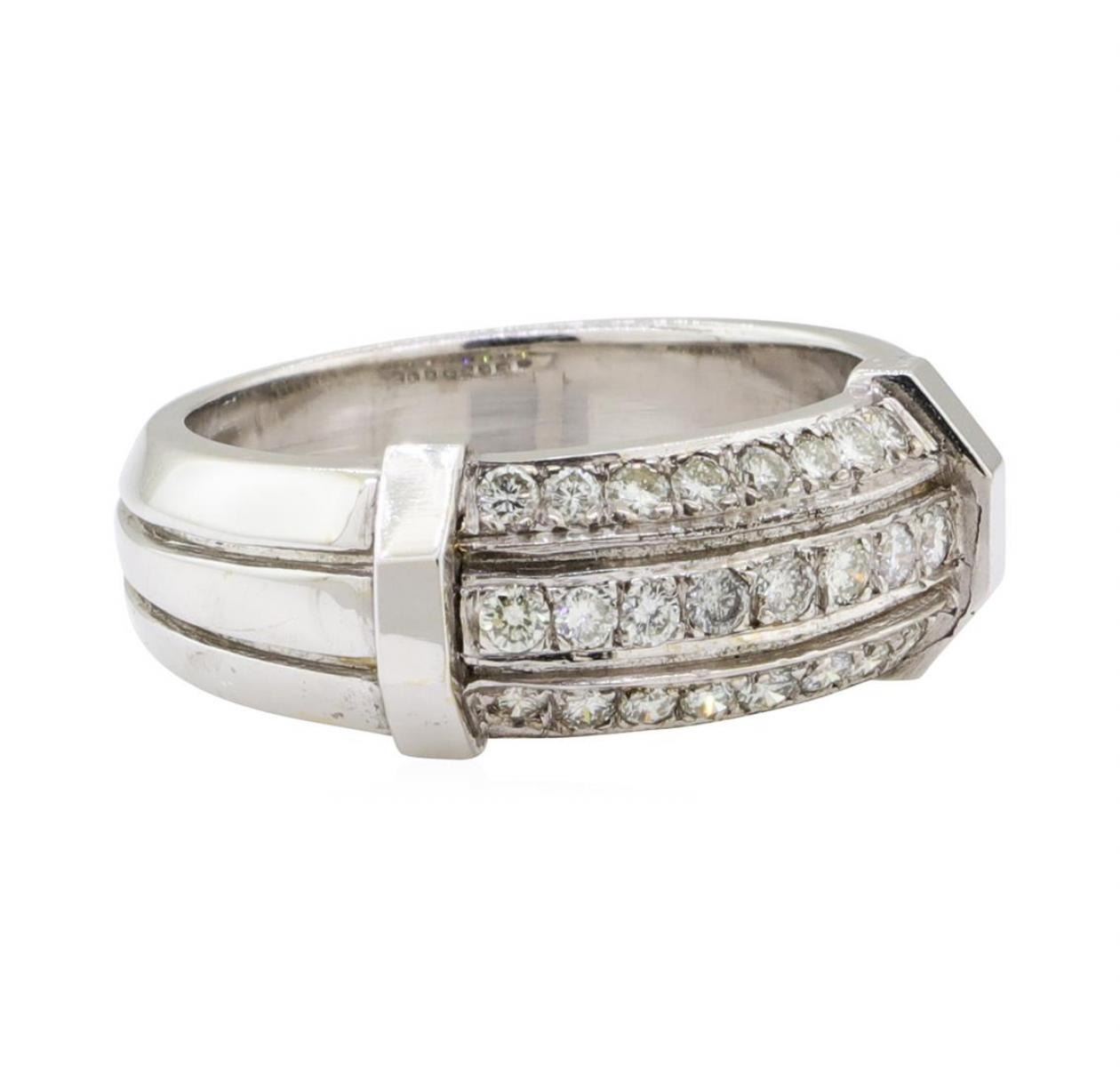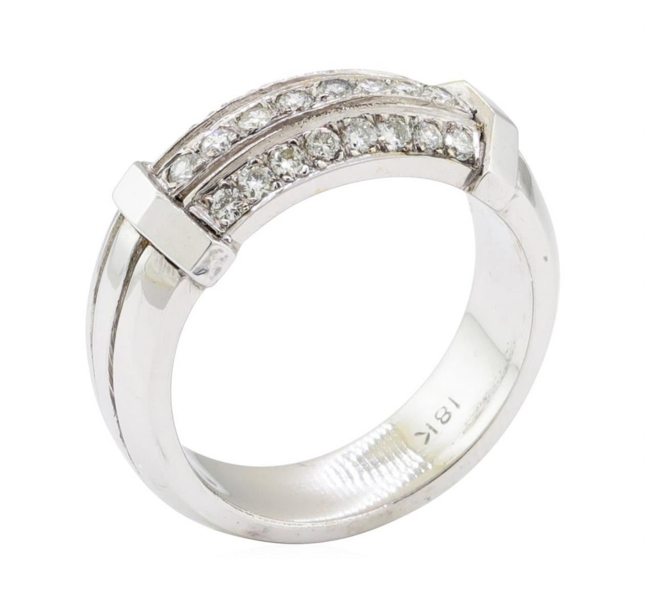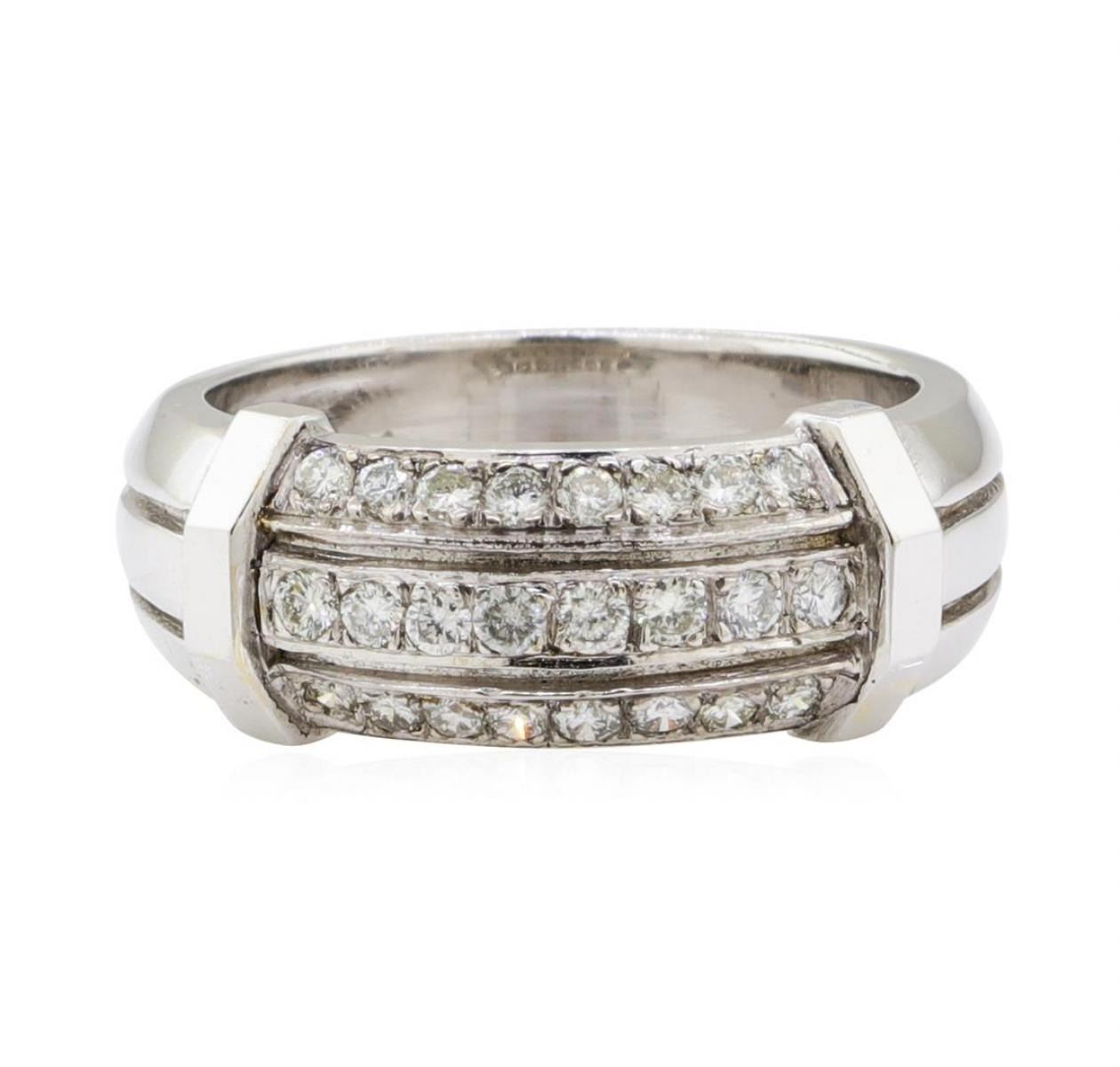 One electronically tested 18KT white gold lady's cast fashion ring with a three row wide band with a bright polish finish. The featured lady's ring has a shank measuring 5.30 millimeters wide. Identified with markings of '18K'. Condition is like new, good workmanship. Containing: Twenty-Four bead set round brilliant cut diamonds, measuring 1.90 - 1.70 x 1.12mm (depth est.) approximate total weight of 24 Stones = 0.55ct. Graded in the setting. Color H - I Clarity SI-1 to SI-2 Cut Good. Total Weight of Diamonds 0.55ct.. Total Weight of Ring 9.30gm GAS Appraised at $3150.00. GAS Appraised.