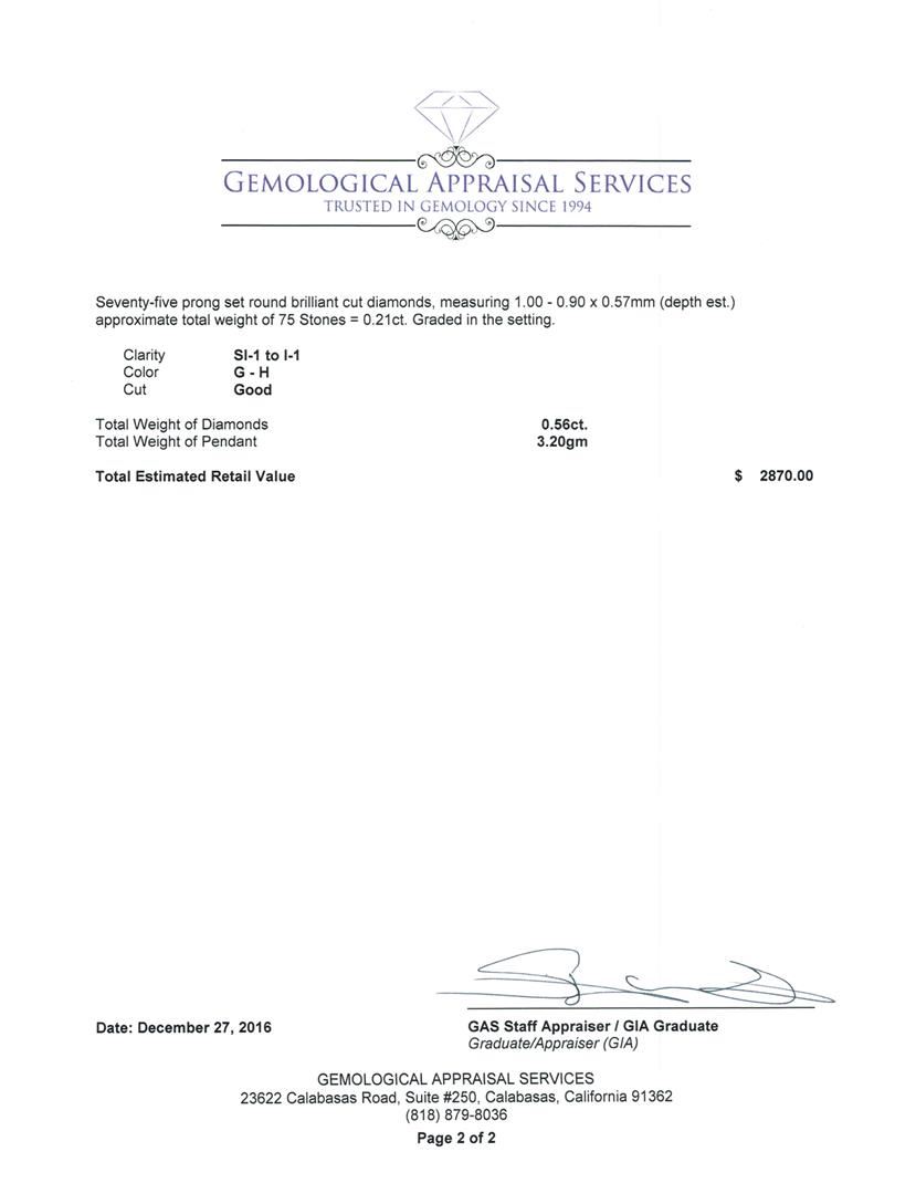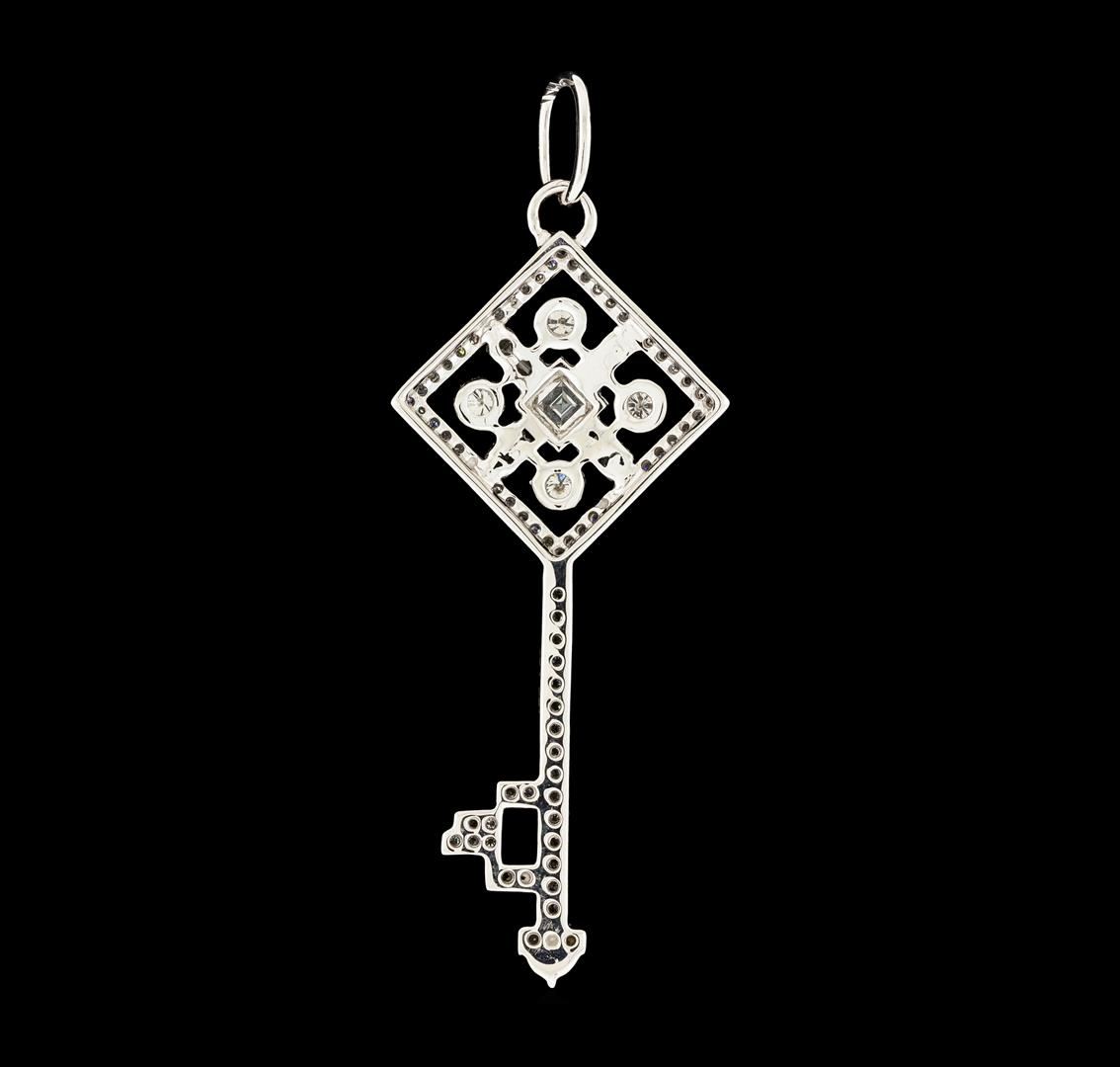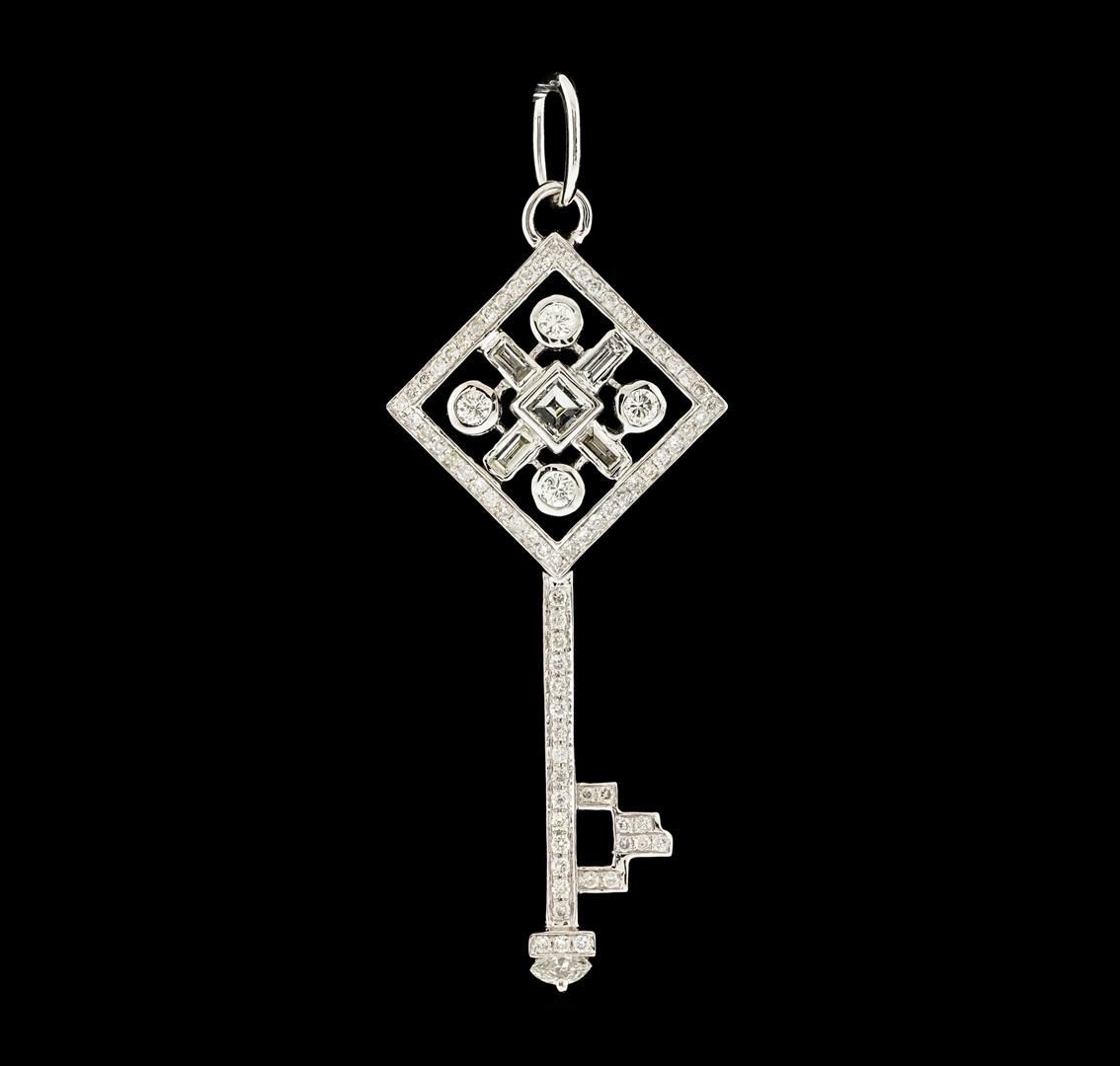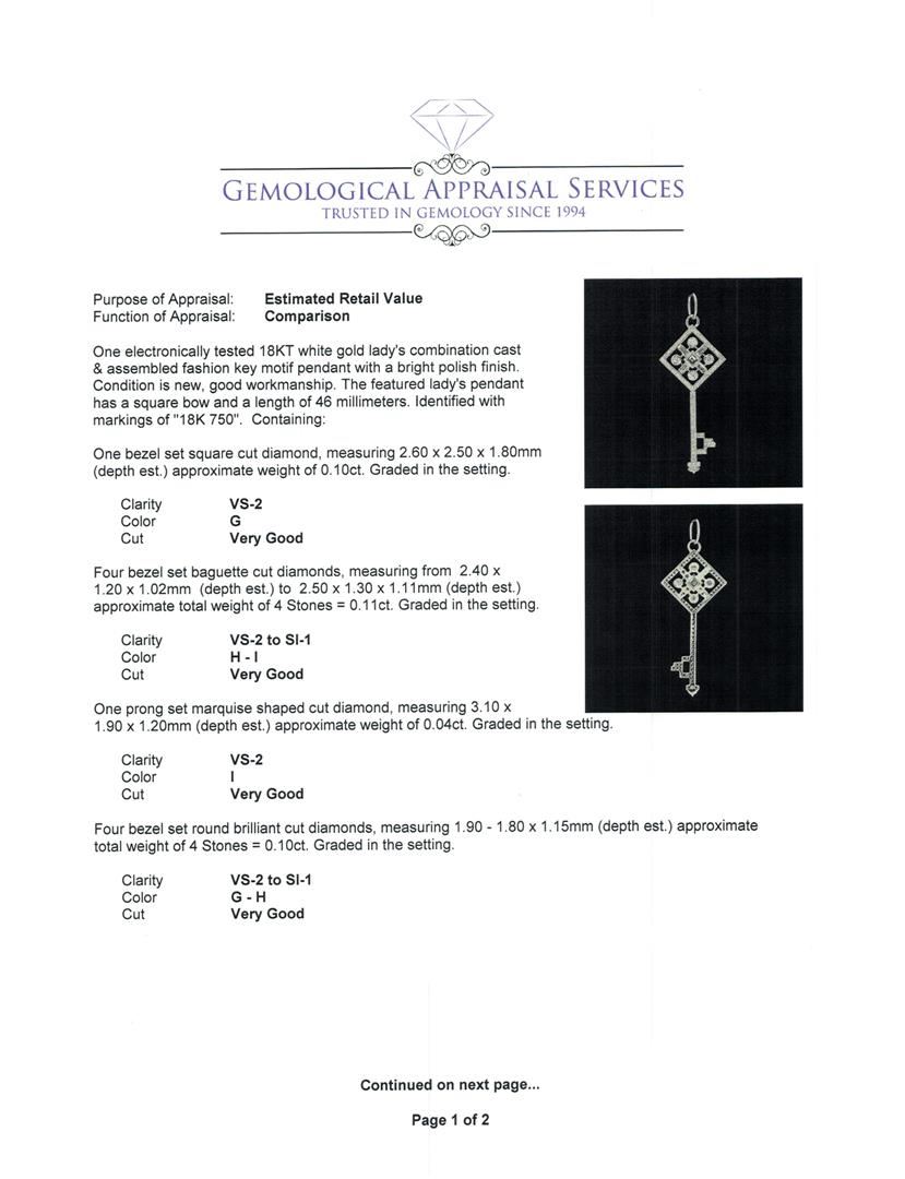 One electronically tested 18KT white gold lady's combination cast & assembled fashion key motif pendant with a bright polish finish. The featured lady's pendant has a square bow and a length of 46 millimeters. Identified with markings of '18K 750'. Condition is new, good workmanship. Containing: One bezel set square cut diamond, measuring 2.60 x 2.50 x 1.80mm (depth est.) approximate weight of 0.10ct. Graded in the setting. Clarity VS-2. Color: G Cut Very Good Four bezel set baguette cut diamonds, measuring from 2.40 x 1.20 x 1.02mm (depth est.) to 2.50 x 1.30 x 1.11mm (depth est.) approximate total weight of 4 Stones = 0.11ct. Graded in the setting. Clarity VS-2 to SI-1. Color: H - I Cut Very Good One prong set marquise shaped cut diamond, measuring 3.10 x 1.90 x 1.20mm (depth est.) approximate weight of 0.04ct. Graded in the setting. Clarity VS-2. Color: I Cut Very Good Four bezel set round brilliant cut diamonds, measuring 1.90 - 1.80 x 1.15mm (depth est.) approximate total weight of 4 Stones = 0.10ct. Graded in the setting. Clarity VS-2 to SI-1. Color: G - H Cut Very Good Seventy-Five prong set round brilliant cut diamonds, measuring 1.00 - 0.90 x 0.57mm (depth est.) approximate total weight of 75 Stones = 0.21ct. Graded in the setting. Clarity SI-1 to I-1. Color: G - H Cut Good. Total Weight of Diamonds 0.56ct.. Total Weight of Pendant 3.20gm. GAS Appraised.
