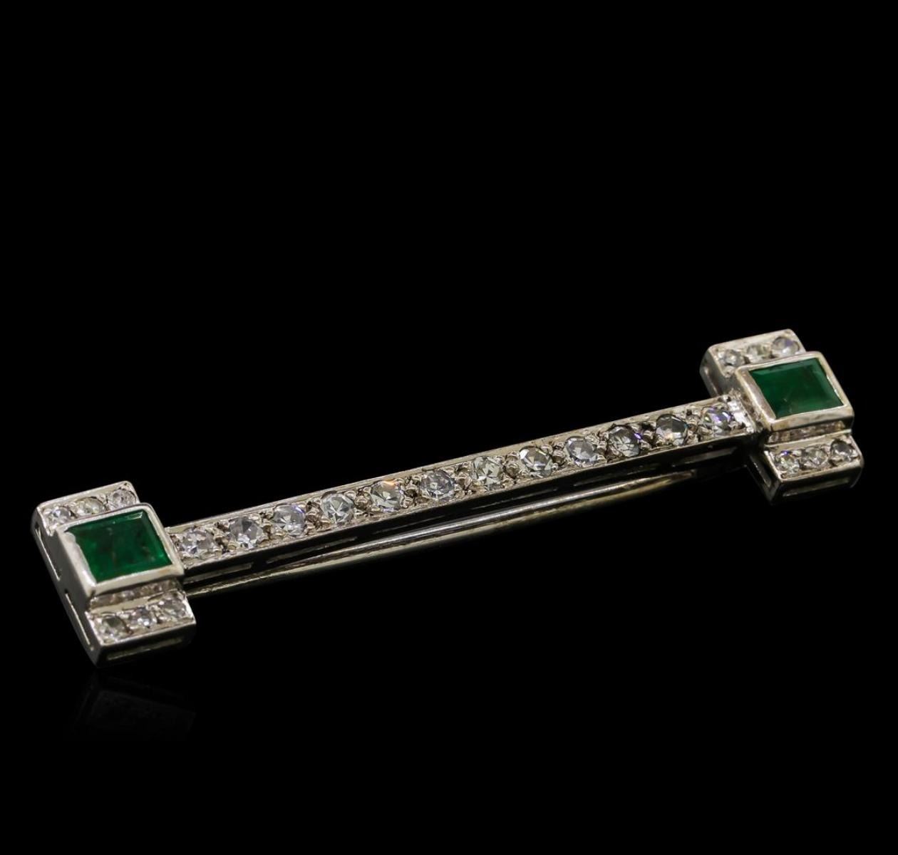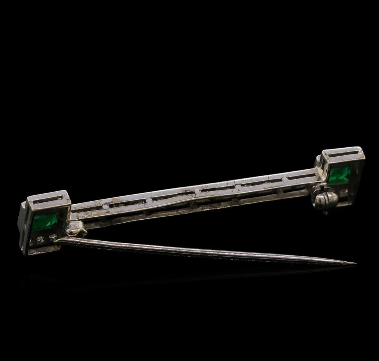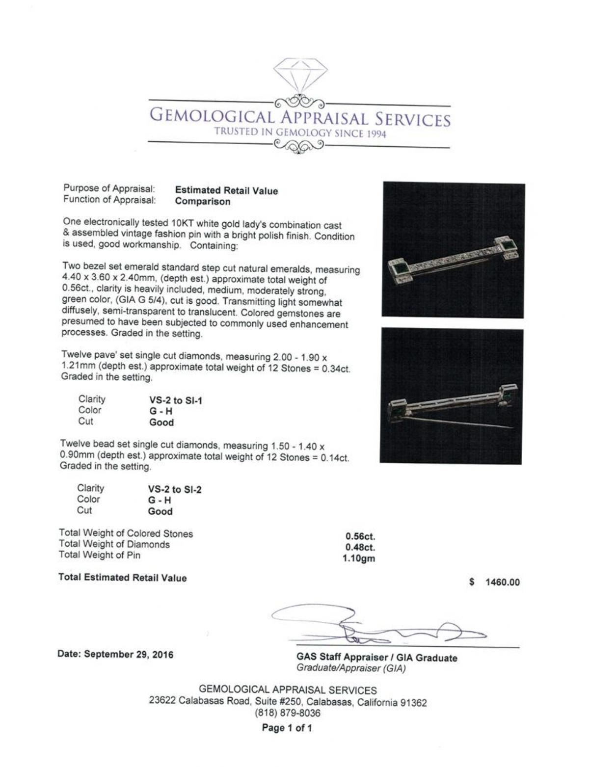 One electronically tested 10KT white gold lady's combination cast & assembled vintage fashion pin with a bright polish finish. Condition is used, good workmanship. Containing: Two bezel set emerald standard step cut natural emeralds, measuring 4.40 x 3.60 x 2.40mm, (depth est.) approximate total weight of 0.56ct., clarity is heavily included, medium, moderately strong, green color, (GIA G 5/4), cut is good. Transmitting light somewhat diffusely, semi-transparent to translucent. Colored gemstones are presumed to have been subjected to commonly used enhancement processes. Graded in the setting. Twelve pave' set single cut diamonds, measuring 2.00 - 1.90 x 1.21mm (depth est.) approximate total weight of 12 Stones = 0.34ct. Graded in the setting. Clarity VS-2 to SI-1. Color: G - H Cut Good Twelve bead set single cut diamonds, measuring 1.50 - 1.40 x 0.90mm (depth est.) approximate total weight of 12 Stones = 0.14ct. Graded in the setting. Clarity VS-2 to SI-2. Color: G - H Cut Good. Total Weight of Colored Stones 0.56ct.. Total Weight of Diamonds 0.48ct.. Total Weight of Pin 1.10gm. GAS Appraised.