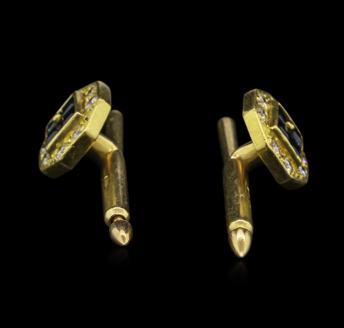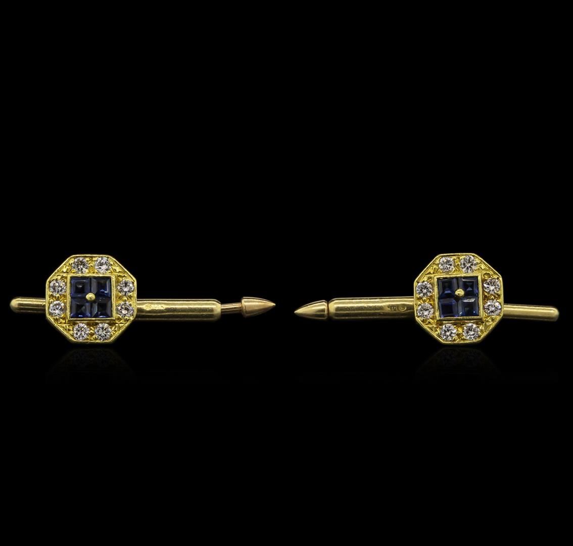 One pair electronically tested 14KT yellow gold gents cast & assembled sapphire and diamond shirt studs. Condition is good. Each tuxedo shirt stud features an organized sapphire cluster set within a diamond bezel. Bright polish finish Identified with markings of "14K". Containing: Eight channel set square step cut natural blue sapphires, measuring 2.20 x 2.10 x 1.30mm, approximate total weight of 0.58ct., clarity is eye clean, type II, medium dark, moderately strong, violetish blue color, (GIA vB 6/4), cut is good. Transmitting light with no distortion, transparent. Color grade is an average for the group. Graded in the setting. Sixteen bead set round brilliant cut diamonds, measuring 1.80 - 1.70 x 1.05mm (depth est.) approximate total weight of 16 Stones = 0.41ct. Graded in the setting. Clarity: VS-2 to SI-1. Color: F- G. Total Weight of Colored Stones: 0.58ct. Total Weight of Diamonds: 0.41ct. Total Weight of Shirt Studs: 3.37 gm. AIG Appraised.