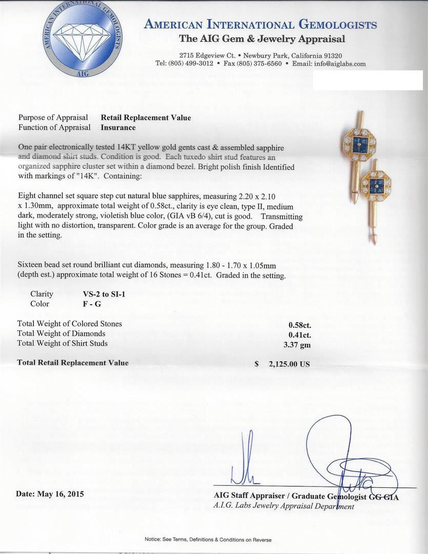 One pair electronically tested 14KT yellow gold gents cast & assembled sapphire and diamond shirt studs. Condition is good. Each tuxedo shirt stud features an organized sapphire cluster set within a diamond bezel. Bright polish finish Identified with markings of "14K". Containing: Eight channel set square step cut natural blue sapphires, measuring 2.20 x 2.10 x 1.30mm, approximate total weight of 0.58ct., clarity is eye clean, type II, medium dark, moderately strong, violetish blue color, (GIA vB 6/4), cut is good. Transmitting light with no distortion, transparent. Color grade is an average for the group. Graded in the setting. Sixteen bead set round brilliant cut diamonds, measuring 1.80 - 1.70 x 1.05mm (depth est.) approximate total weight of 16 Stones = 0.41ct. Graded in the setting. Clarity: VS-2 to SI-1. Color: F- G. Total Weight of Colored Stones: 0.58ct. Total Weight of Diamonds: 0.41ct. Total Weight of Shirt Studs: 3.37 gm. AIG Appraised.