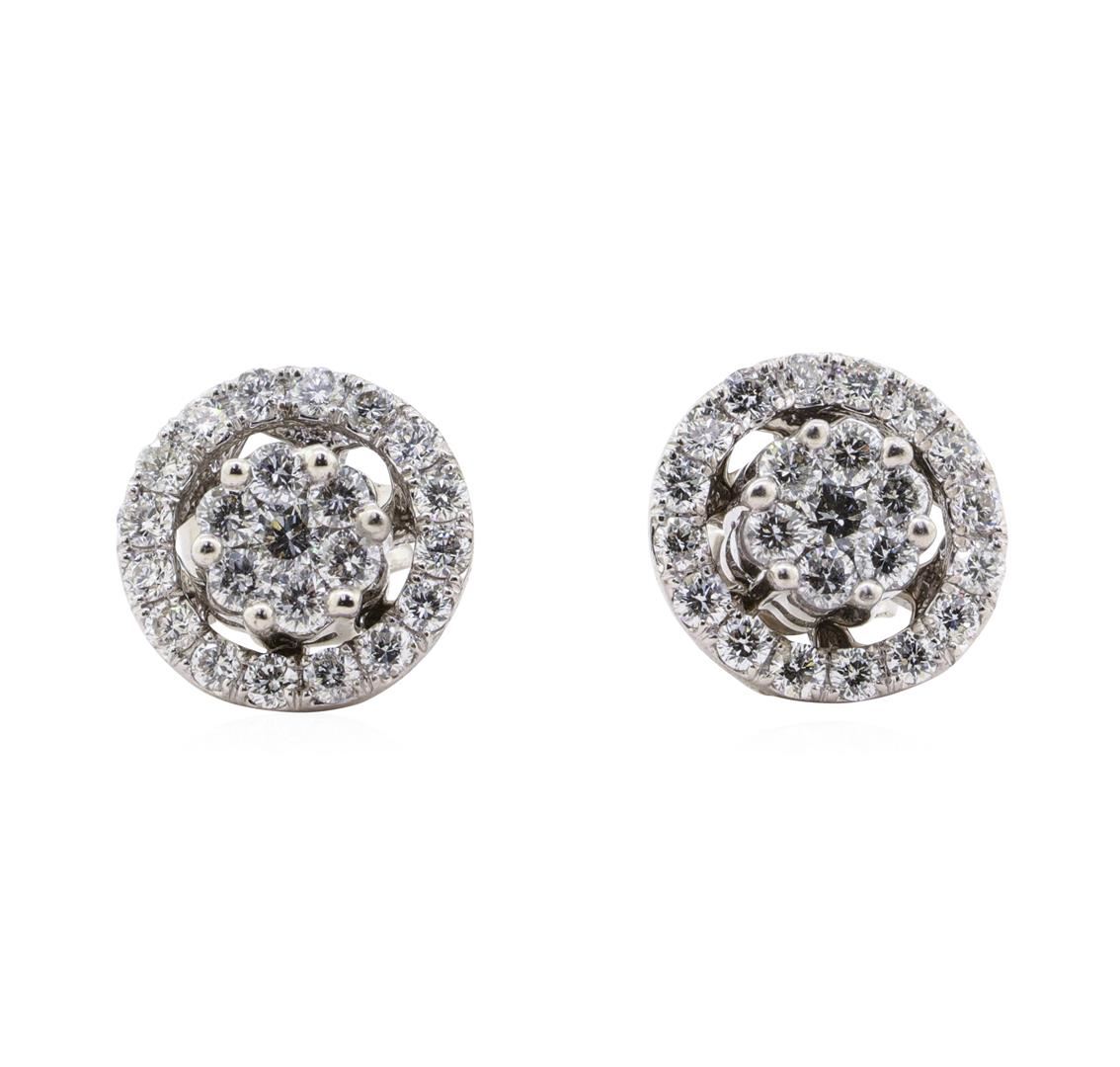 One pair electronically tested 14KT white gold lady's combination cast & assembled fashion stud earrings with earring jackets with medium friction backs with a bright polish finish. Identified with markings of '14K'. Condition is Good. Containing: Two prong set round brilliant cut diamonds, measuring 2.00 - 1.95 x 1.23mm (depth est.) approximate total weight of 2 Stones = 0.06ct. Graded in the setting. Color H - I Clarity SI-1 to SI-2 Cut Good Forty-Four prong set round brilliant cut diamonds, measuring 1.50 - 1.40 x 0.90mm (depth est.) approximate total weight of 44 Stones = 0.53ct. Graded in the setting. Color H - I Clarity SI-1 to SI-2 Cut Good. Total Weight of Diamonds 0.59ct.. Total Weight of Earrings With Earring Jackets 2.40gm GAS Appraised at $1985.00. GAS Appraised.