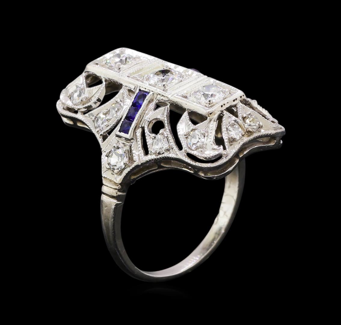 One electronically tested platinum ladies cast diamond and sapphire ring. The ring features a vertical series of three diamonds set within a diamond set lattice curvature with sapphire ribbon accents, completed by a one millimeter wide band. Bright and patterned finish with milgrain detailing. Condition is good. Containing: One prong set transitional cut diamond, measuring 3.50 - 3.50 x 1.90mm (depth est.) approximate weight of 0.14ct. Graded in the setting. Clarity: I-1 . Color: G Two prong set transitional cut diamonds, measuring 3.00. - 2.80 x 1.80mm (depth est.) approximate total weight of 2 Stones = 0.19ct. Graded in the setting. Clarity: SI-1 . Color: G - H Ten prong set single cut diamonds, measuring 2.30 - 1.50 x 1.14mm (depth est.) approximate total weight of 10 Stones = 0.26ct. Graded in the setting. Clarity: SI-1 to I-1 . Color: G - I Six channel set square mixed cut blue sapphires, measuring 1.50 x 1.40 x 0.94mm, approximate total weight of 0.12ct., clarity is eye clean, type II, dark, moderately strong, blue color, (GIA B 7/4), cut is good. Transmitting light with no distortion, transparent. The group contains a mix of natural and laboratory created sapphires. Measurements & the color grade are an average for the group. raded in the setting. Total Weight of Colored Stones 0.12ct.. Total Weight of Diamonds 0.59ct.. Total Weight of Ring 4.63gm. AIG Appraised.