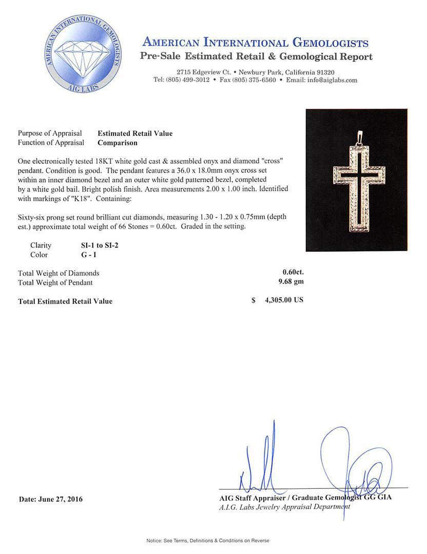 One electronically tested 18KT white gold cast & assembled onyx and diamond "cross" pendant. The pendant features a 36.0 x 18.0mm onyx cross set within an inner diamond bezel and an outer white gold patterned bezel, completed by a white gold bail. Bright polish finish. Area measurements 2.00 x 1.00 inch. Identified with markings of "K18". Condition is good. Containing: Sixty-Six prong set round brilliant cut diamonds, measuring 1.30 - 1.20 x 0.75mm (depth est.) approximate total weight of 66 Stones = 0.60ct. Graded in the setting. Clarity: SI-1 to SI-2. Color: G - I. Total Weight of Diamonds 0.60ct. Total Weight of Pendant 9.68gm. AIG Appraised.