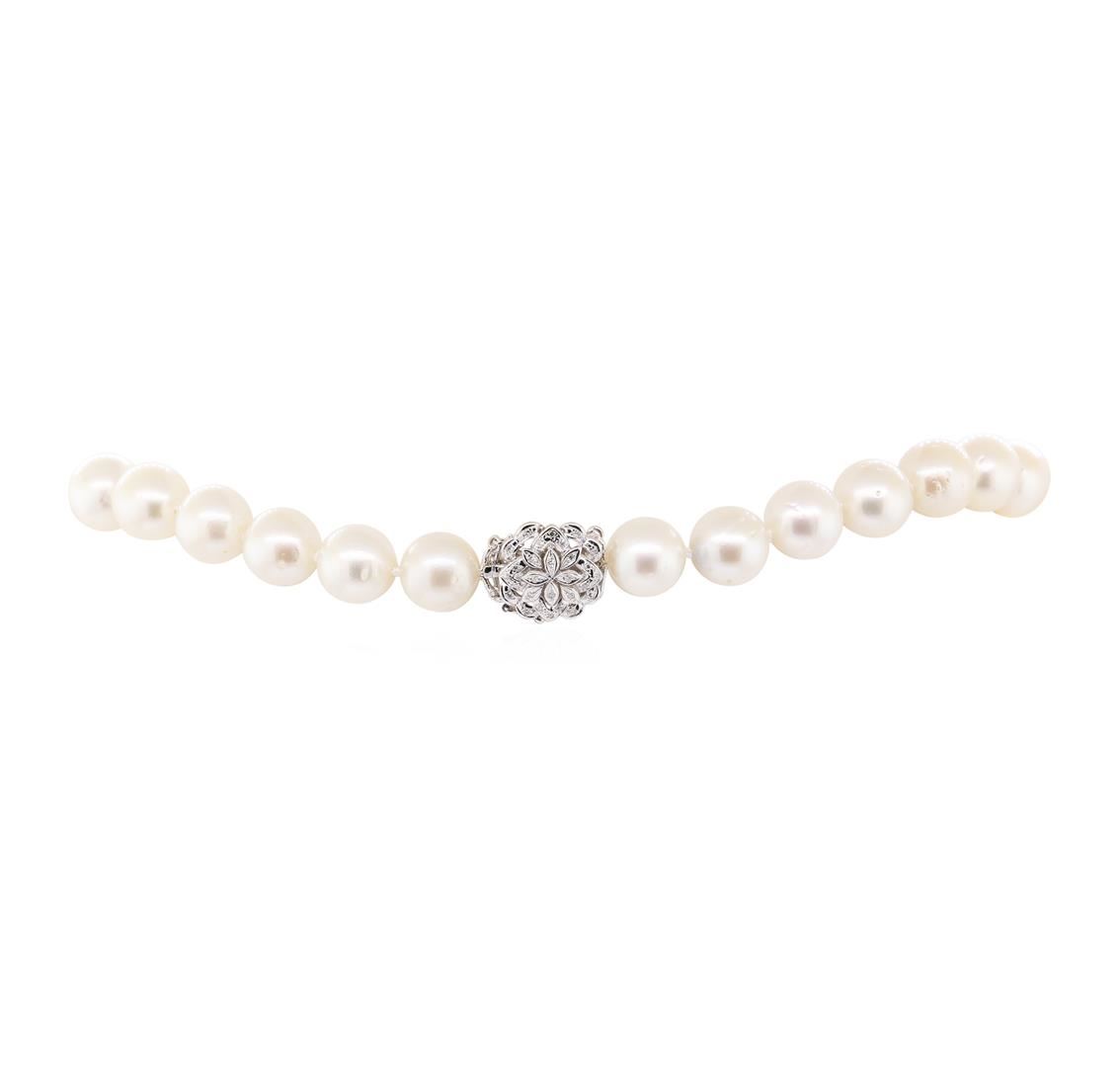 One graduated single strand pearl necklace 18.5' princess length, knotted with a tongue clasp & foldover safety containing 33 south sea cultured pearls, 14.8mm to 11.9mm in size. The pearls are white in color with a good luster, round to near round, and m GAS Appraised.