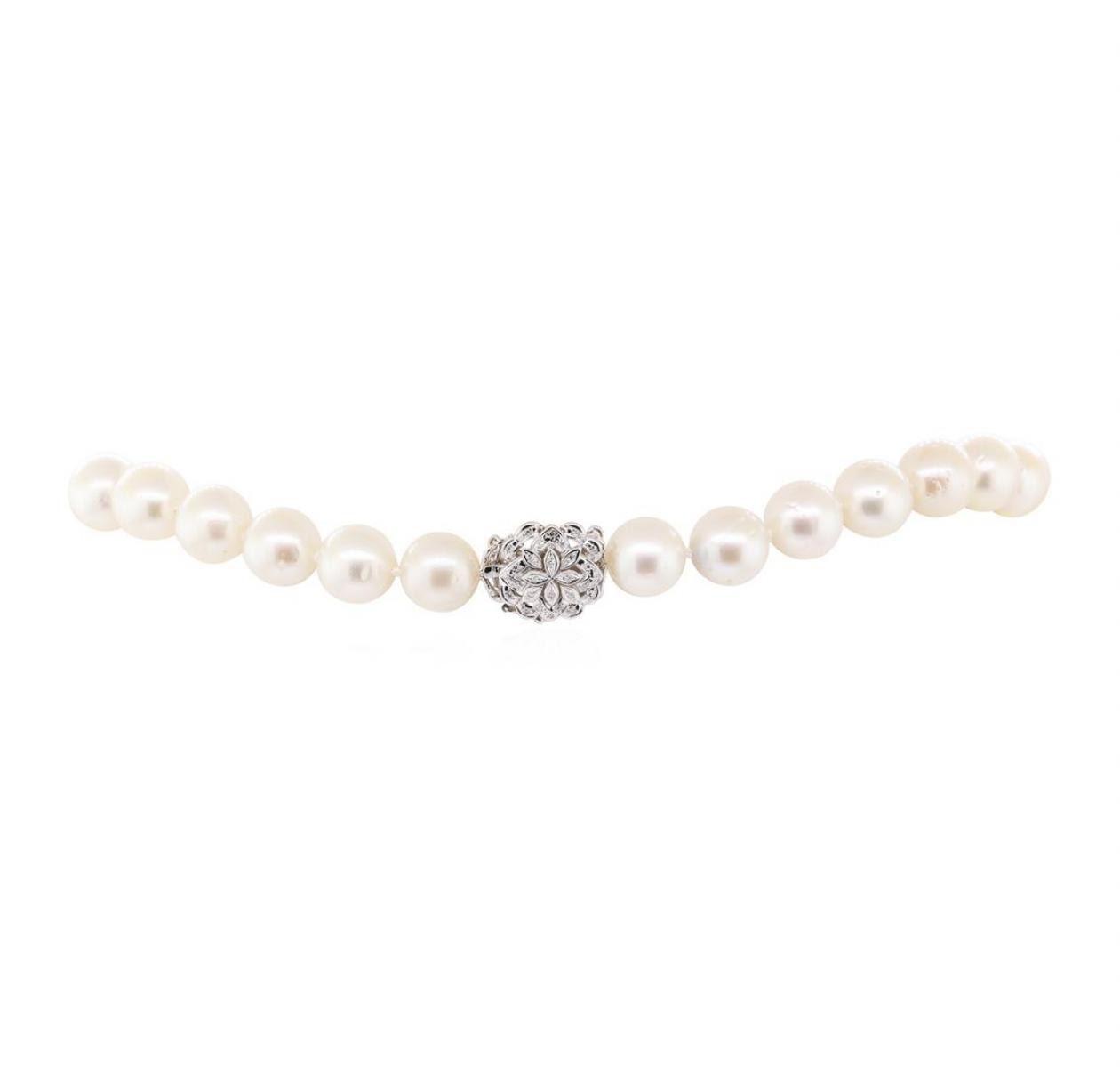 One graduated single strand pearl necklace 18.5' princess length, knotted with a tongue clasp & foldover safety containing 33 south sea cultured pearls, 14.8mm to 11.9mm in size. The pearls are white in color with a good luster, round to near round, and moderately blemished with very good matching. The featured pearl necklace has six white gold rondels and is terminated in a white gold clasp. Graded on the strand.South Sea cultured pearls are farmed in the oceans surrounding Australia, Indonesia, the Philippines and the southern coast of China. The main source of Australian South Sea pearls lies in the northwest on the Kimberly coast. South Sea cultured pearls are formed in the Pinctada Maxima oyster. These pearls take between two to three years to grow and have a unique nacre due to the fast moving and clean waters of the South Seas. One Hundred prong set single cut diamonds, measuring 1.20 - 1.10 x 0.71mm (depth est.) approximate total weight of 100 Stones = 0.60 ct. Graded in the setting. Color H - I Clarity VS-2 to SI-1 Cut Very Good. Total Weight of Diamonds 0.60 ct.. Total Weight of 104.20gm GAS Appraised at $40305.00. GAS Appraised.