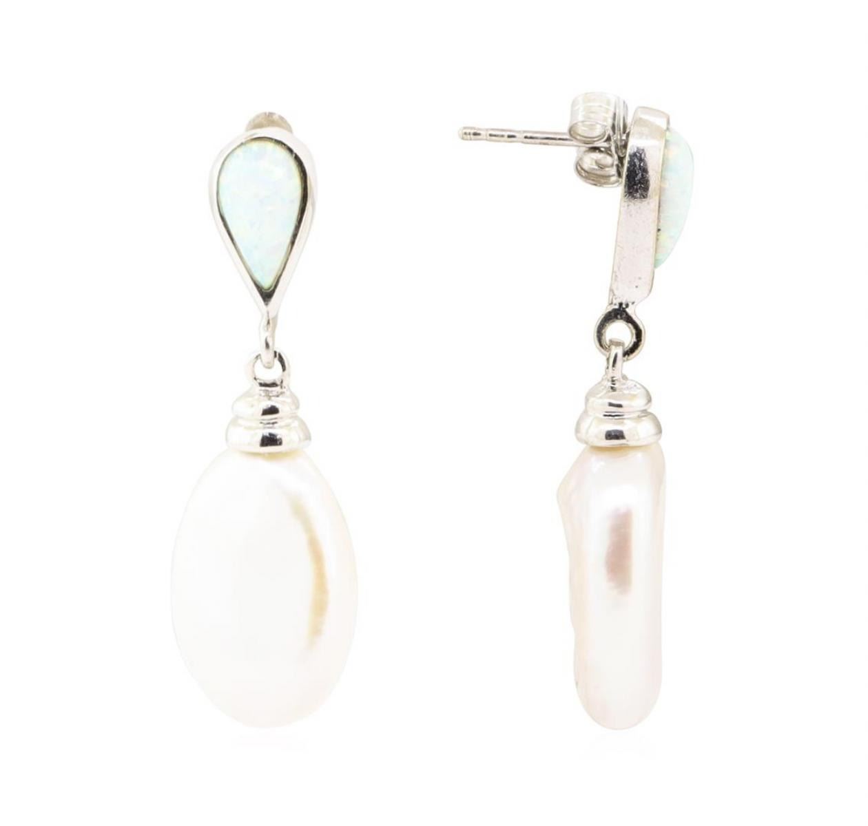One pair of earrings with a drop of approximately 34 millimeters featuring: 18KT white gold weighing 6.2 grams containing two pear shaped opals weighing 0.60 ctw and two baroque pearls.