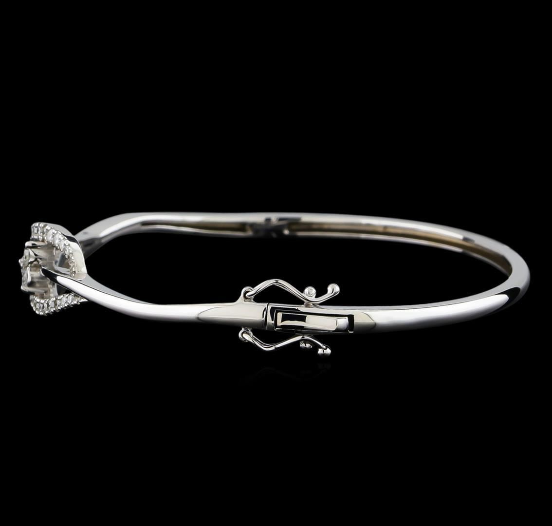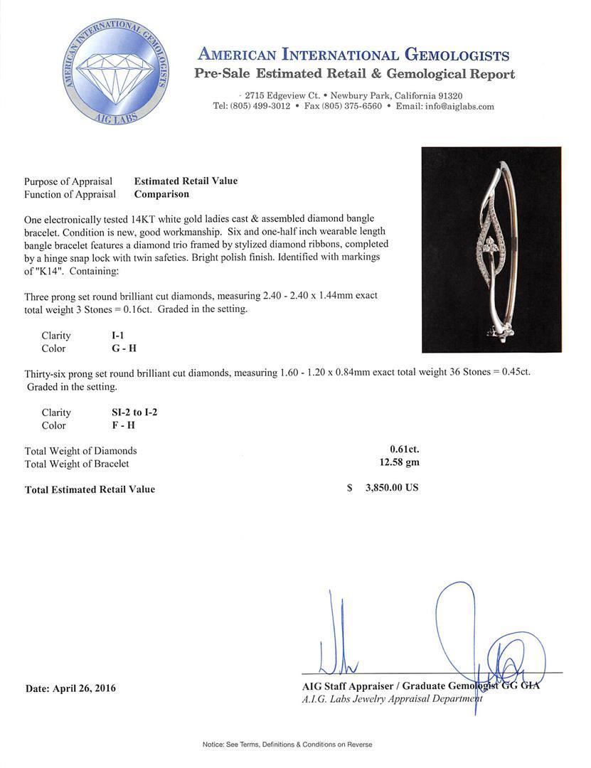 One electronically tested 14KT white gold ladies cast & assembled diamond bangle bracelet. Six and one-half inch wearable length bangle bracelet features a diamond trio framed by stylized diamond ribbons, completed by a hinge snap lock with twin safeties. Bright polish finish. Identified with markings of "K14". Condition is new, good workmanship. Containing: Three prong set round brilliant cut diamonds, measuring 2.40 - 2.40 x 1.44mm exact total weight 3 Stones = 0.16ct. Graded in the setting. Clarity: I-1. Color: G - H Thirty-Six prong set round brilliant cut diamonds, measuring 1.60 - 1.20 x 0.84mm exact total weight 36 Stones = 0.45ct. Graded in the setting. Clarity: SI-2 to I-2. Color: F - H. Total Weight of Diamonds 0.61ct. Total Weight of Bracelet 12.58gm. AIG Appraised.