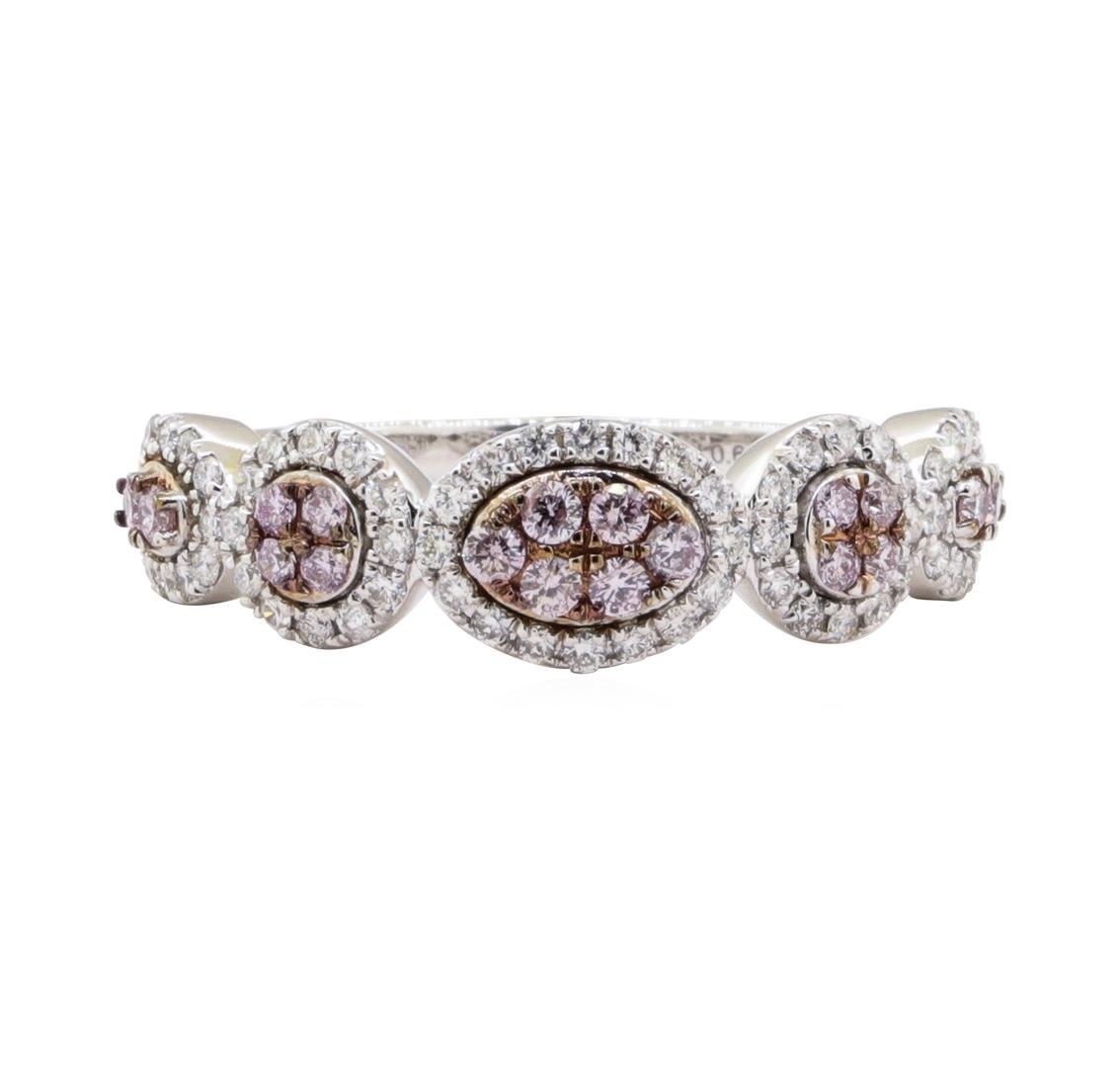 One electronically tested 18KT white gold ladies cast & assembled diamond ring. The ring features a series of pink diamond clusters set within white diamond bezels, supported by elaborate lattice under galleries, completed by a two millimeter wide band. Bright polish finish with rose gold accents. Trademark is ADG. Identified with markings of "18K". Condition is new, good workmanship. Containing: Eighteen prong set round brilliant cut diamonds approximate total weight of 18 Stones = 0.27ct. Graded in the setting. Clarity SI-2 to I-2 Color Faint to Very Light Pink. Sixty-Four prong set round brilliant cut diamonds approximate total weight of 64 Stones = 0.34ct. The clarity & color grade reflect the overall average for the group. Graded in the setting. Clarity SI-2 to I-2 Color F - H Total Weight of Diamonds 0.61 ct. Total Weight of Ring 3.80 gm Estimated Retail Value $ 3,935.00 US