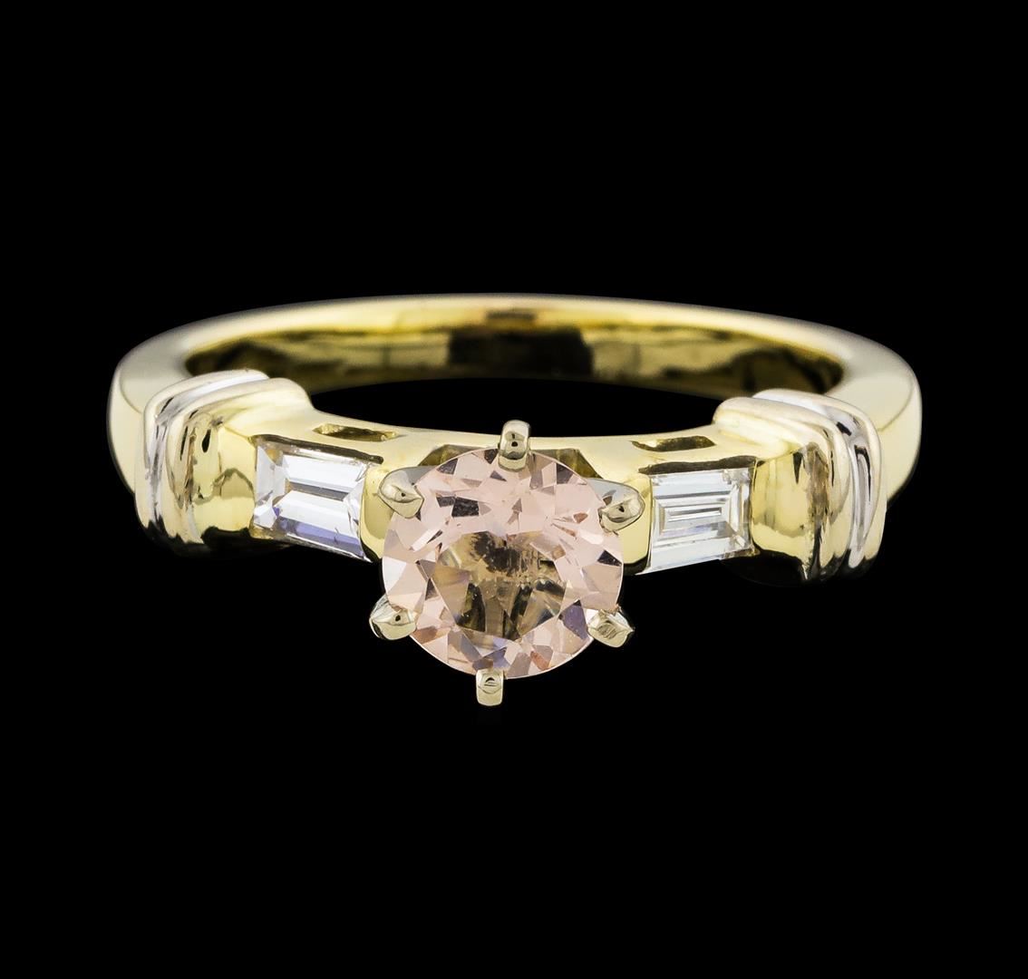 One Morganite and Diamond Ring featuring: 14KT Yellow Gold with a total weight of 5.15 grams, Morganite with a total weight of 0.63ct, and side diamonds with a total weight of 0.20ctw.