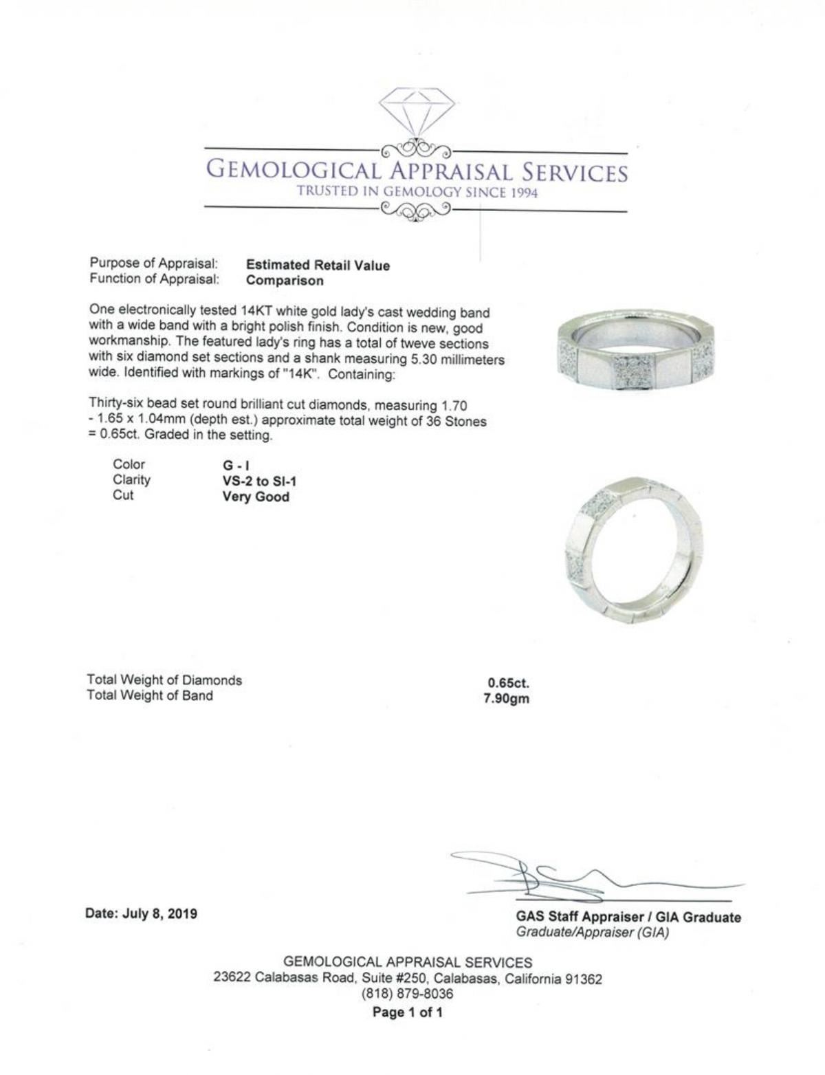 One electronically tested 14KT white gold lady's cast wedding band with a wide band with a bright polish finish. The featured lady's ring has a total of twelve sections with six diamond set sections and a shank measuring 5.30 millimeters wide. Identified with markings of '14K'. Condition is new, good workmanship. Containing: Thirty-Six bead set round brilliant cut diamonds, measuring 1.70 - 1.65 x 1.04mm (depth est.) approximate total weight of 36 Stones = 0.65ct. Graded in the setting. Color G - I Clarity VS-2 to SI-1 Cut Very Good. Total Weight of Diamonds 0.65ct.. Total Weight of Band 7.90gm GAS Appraised at $2755.00. GAS Appraised.