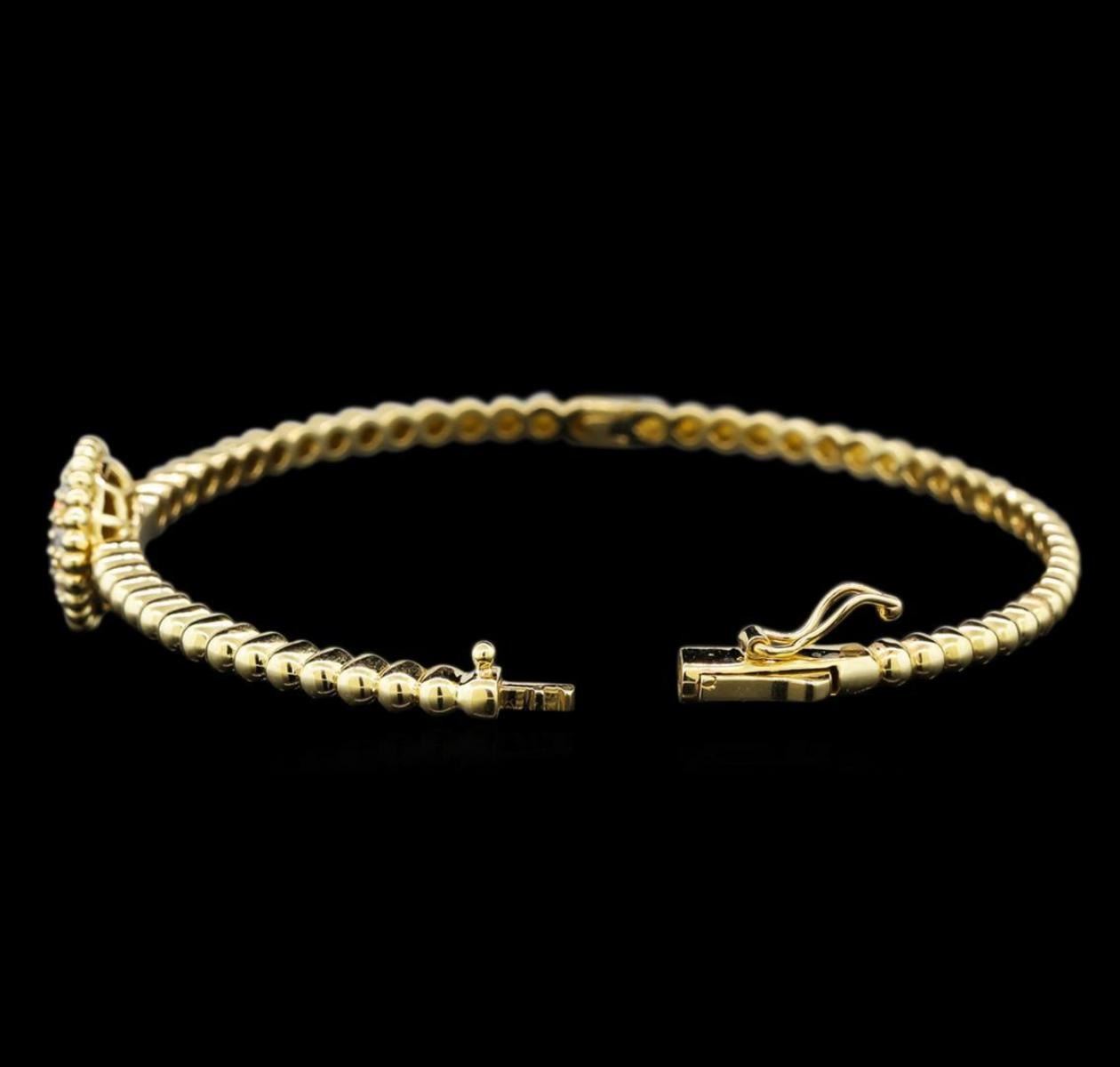 One electronically tested 14KT yellow gold lady's combination cast & assembled fashion bangle bracelet with a tongue clasp with foldover safety with a bright polish finish. The featured lady's bangle bracelet has a straight line scalloped motif and measures approximately 7 inches in length. Identified with markings of 'K14'. Condition is new, good workmanship. Containing: Eight prong set round brilliant cut diamonds, measuring 2.80 - 2.75 x 1.72mm (depth est.) approximate total weight of 8 Stones = 0.65ct. Graded in the setting. Clarity SI-1 to I-1. Color: H - I Cut Good. Total Weight of Diamonds 0.65ct.. Total Weight of Bangle Bracelet 13.60gm. GAS Appraised.
