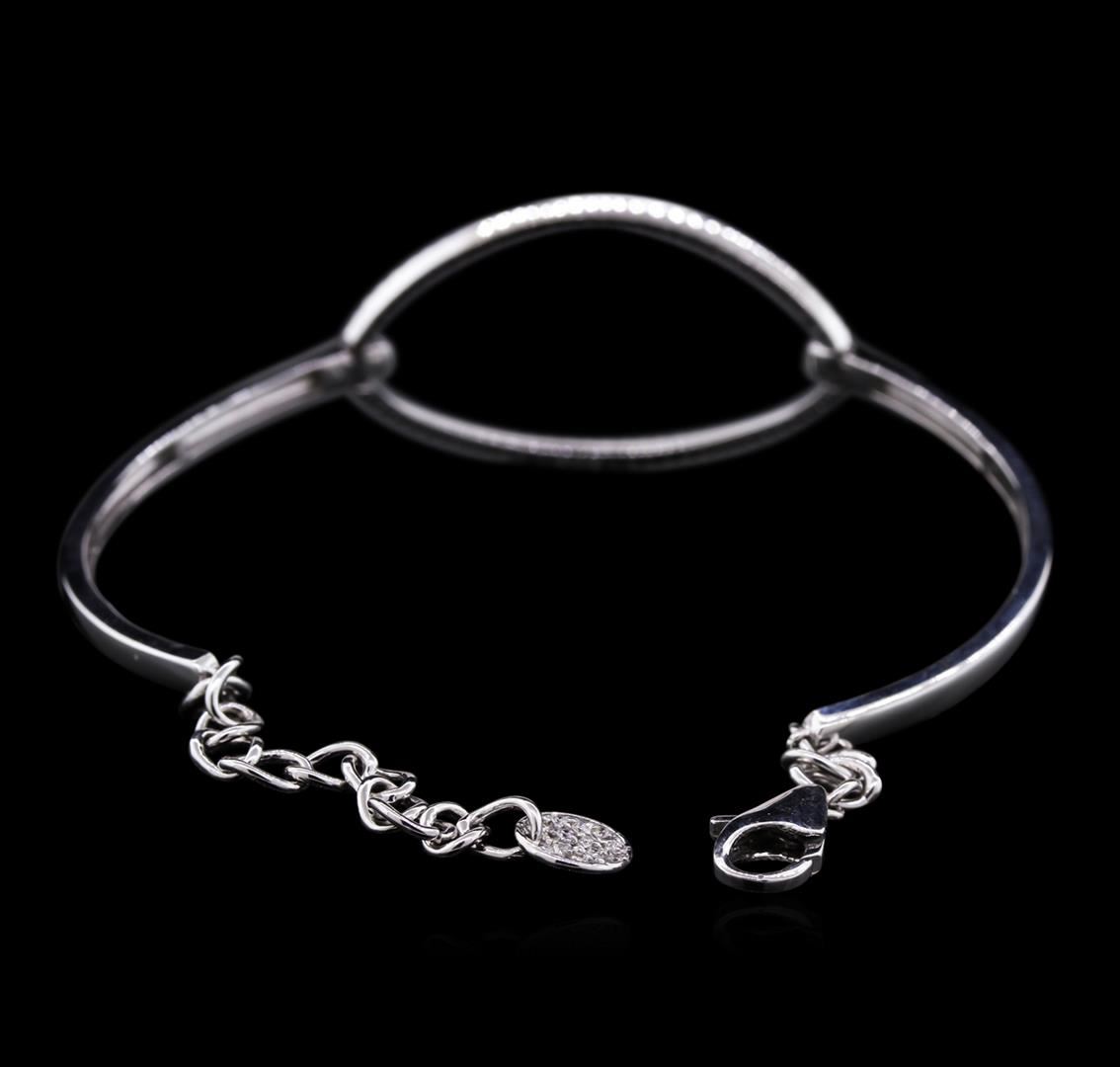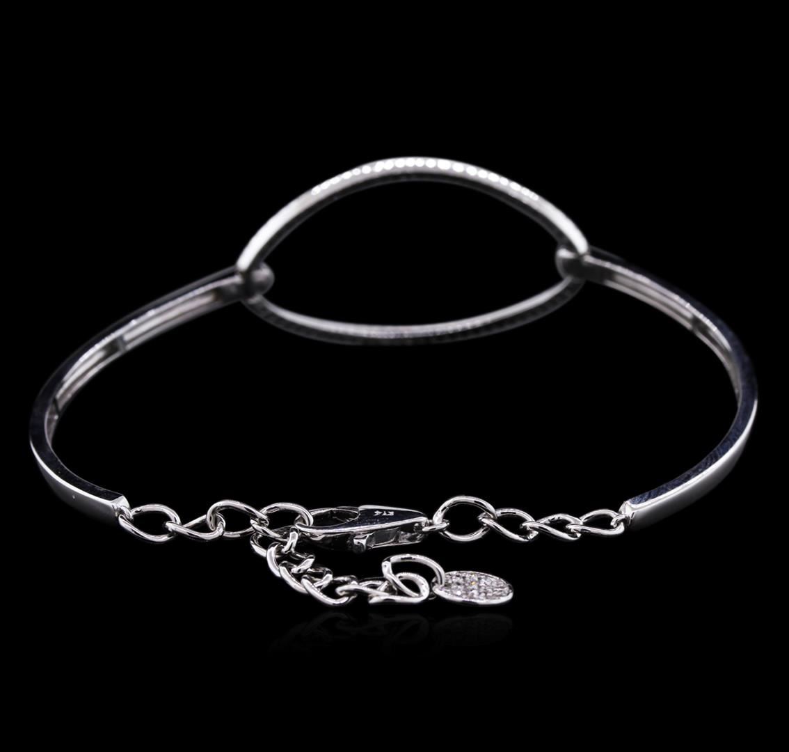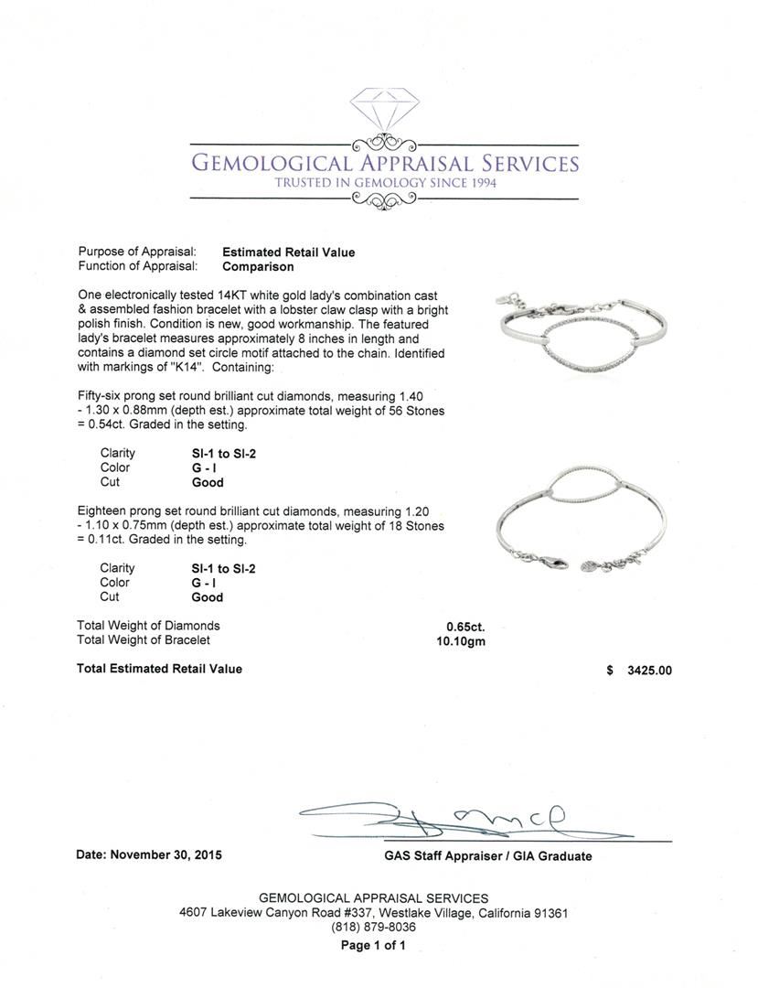One electronically tested 14KT white gold lady's combination cast & assembled fashion bracelet with a lobster claw clasp with a bright polish finish. The featured lady's bracelet measures approximately 8 inches in length and contains a diamond set circle motif attached to the chain. Identified with markings of "K14". Condition is new, good workmanship. Containing: Fifty-Six prong set round brilliant cut diamonds, measuring 1.40 - 1.30 x 0.88mm (depth est.) approximate total weight of 56 Stones = 0.54ct. Graded in the setting. Clarity: SI-1 to SI-2 . Color: G - I. Cut Good Eighteen prong set round brilliant cut diamonds, measuring 1.20 - 1.10 x 0.75mm (depth est.) approximate total weight of 18 Stones = 0.11ct. Graded in the setting. Clarity: SI-1 to SI-2 . Color: G - I. Cut Good. Total Weight of Diamonds 0.65ct.. Total Weight of Bracelet 10.10gm at $ 3425.00 GAS Appraised.