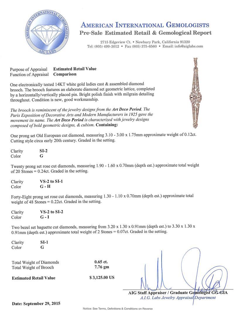 One electronically tested 14KT white gold ladies cast & assembled diamond brooch. The brooch features an elaborate diamond set geometric lattice, completed by a horizontally/vertically placed pin. Bright polish finish with milgrain detailing throughout. Condition is new, good workmanship. Containing: One prong set Old European cut diamond, measuring 3.10 - 3.00 x 1.75mm approximate weight of 0.12ct. Cutting style circa early 20th century. Graded in the setting. Clarity: SI-2. Color: G Twenty prong set rose cut diamonds, measuring 1.90 - 1.60 x 0.70mm (depth est.) approximate total weight of 20 Stones = 0.24ct. Graded in the setting. Clarity: VS-2 to SI-1. Color: G - H Forty-Eight prong set rose cut diamonds, measuring 1.30 - 1.10 x 0.70mm (depth est.) approximate total weight of 48 Stones = 0.22ct. Graded in the setting. Clarity: VS-2 to SI-2. Color: G - I Two bezel set baguette cut diamonds, measuring from 3.20 x 1.30 x 0.91mm (depth est.) to 3.30 x 1.30 x 0.91mm (depth est.) approximate total weight of 2 Stones = 0.07ct. Graded in the setting. Clarity: SI-1. Color: G. Total Weight of Diamonds 0.65ct. Total Weight of Brooch 7.76gm. AIG Appraised.