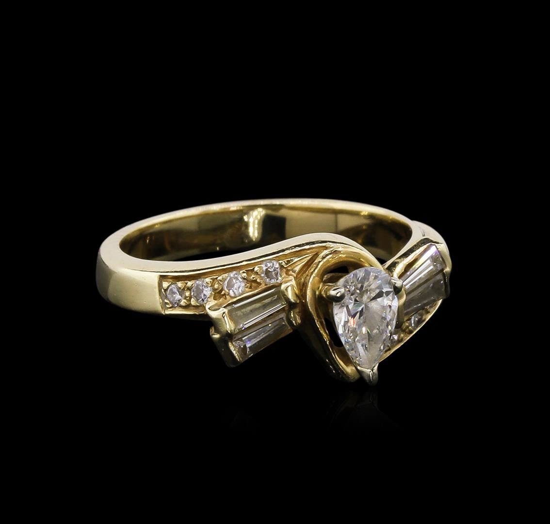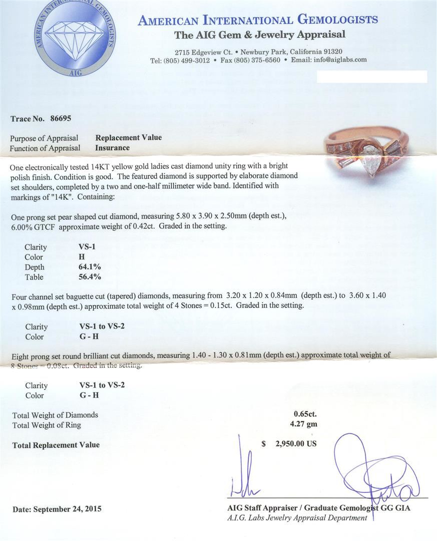 One electronically tested 14KT yellow gold ladies cast diamond unity ring with a bright polish finish. Condition is good. The featured diamond is supported by elaborate diamond set shoulders, completed by a two and one-half millimeter wide band. Identified with markings of "14K." Containing: One prong set pear shaped cut diamond, measuring 5.80 x 3.90 x 2.50mm (depth est.), 6.00% GTCF approximate weight of 0.42ct. Graded in the setting. Clarity: VS-1. Color: H. Depth: 64.1%. Table: 56.4%. Four channel set baguette cut (tapered) diamonds, measuring from 3.20 x 1.20 x 0.84mm (depth est.) to 3.60 x 1.40 x 0.98mm (depth est.) approximate total weight of 4 stones = 0.15ct. Graded in the setting. Clarity: VS-1 to VS-2. Color: G-H. Eight prong set round brilliant cut diamonds, measuring 1.40 - 1.30 x 0.81mm (depth est.) approximate total weight of 8 stones = 0.08ct. Graded in the setting. Clarity: VS-1 to VS-2. Color: G-H. Total Weight of Diamonds: 0.65ct. Total Weight of Ring: 4.27 grams. AIG Appraised.