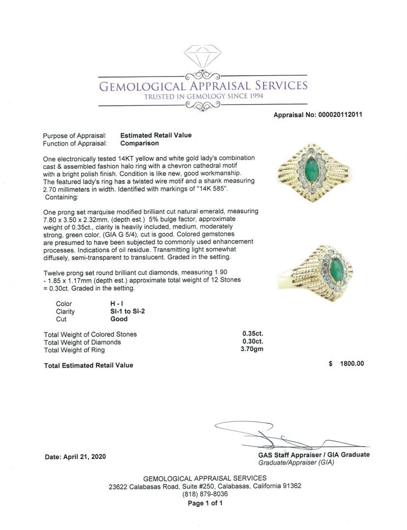 One electronically tested 14KT yellow and white gold lady's combination cast & assembled fashion halo ring with a chevron cathedral motif with a bright polish finish. The featured lady's ring has a twisted wire motif and a shank measuring 2.70 millimeters in width. Identified with markings of '14K 585'. Condition is Good. Containing: One prong set marquise modified brilliant cut natural emerald, measuring 7.80 x 3.50 x 2.32mm, (depth est.) 5%. bulge factor, approximate weight of 0.35ct., clarity is heavily included, medium, moderately strong, green color, (GIA G 5/4), cut is good. Colored gemstones are presumed to have been subjected to commonly used enhancement processes. Indications of oil residue. Transmitting light somewhat diffusely, semi-transparent to translucent. Graded in the setting. Twelve prong set round brilliant cut diamonds, measuring 1.90 - 1.85 x 1.17mm (depth est.) approximate total weight of 12 Stones = 0.30 ct. Graded in the setting. Color H - I Clarity SI-1 to SI-2 Cut Good. Total Weight of Colored Stones 0.35ct.. Total Weight of Diamonds 0.30 ct.. Total Weight of Ring 3.70gm GAS Appraised at $1800.00. GAS Appraised.