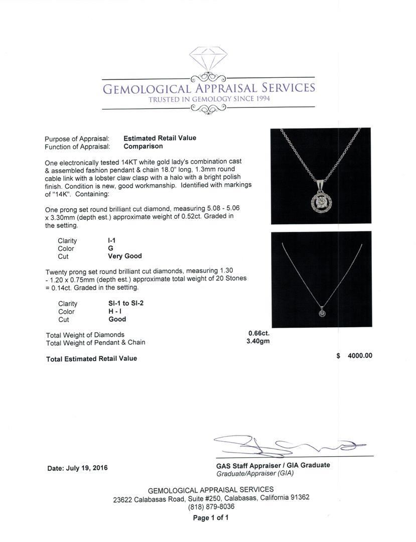 One electronically tested 14KT white gold lady's combination cast & assembled fashion pendant & chain 18.0' long, 1.3mm round cable link with a lobster claw clasp with a halo with a bright polish finish. Identified with markings of '14K'. Condition is new, good workmanship. Containing: One prong set round brilliant cut diamond, measuring 5.08 - 5.06 x 3.30mm (depth est.) approximate weight of 0.52ct. Graded in the setting. Clarity I-1. Color: G Cut Very Good Twenty prong set round brilliant cut diamonds, measuring 1.30 - 1.20 x 0.75mm (depth est.) approximate total weight of 20 Stones = 0.14ct. Graded in the setting. Clarity SI-1 to SI-2. Color: H - I Cut Good. Total Weight of Diamonds 0.66ct.. Total Weight of Pendant & Chain 3.40gm. GAS Appraised.