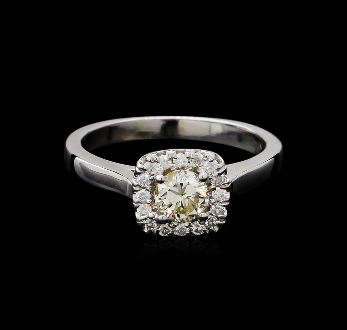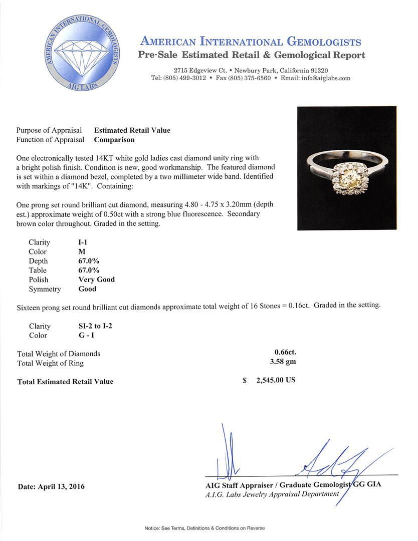 One electronically tested 14KT white gold ladies cast diamond unity ring with a bright polish finish. The featured diamond is set within a diamond bezel, completed by a two millimeter wide band. Identified with markings of "14K". Condition is new, good workmanship. Containing: One prong set round brilliant cut diamond, measuring 4.80 - 4.75 x 3.20mm (depth est.) approximate weight of 0.50ct with a strong blue fluorescence. Secondary brown color throughout. Graded in the setting. Clarity: I-1. Color: M. Depth 67.0%. Table 67.0%. Sixteen prong set round brilliant cut diamonds approximate total weight of 16 Stones = 0.16ct. Graded in the setting. Clarity: SI-2 to I-2. Color: G - I. Total Weight of Diamonds 0.66ct. Total Weight of Ring 3.58gm. AIG Appraised at $2,545.00.