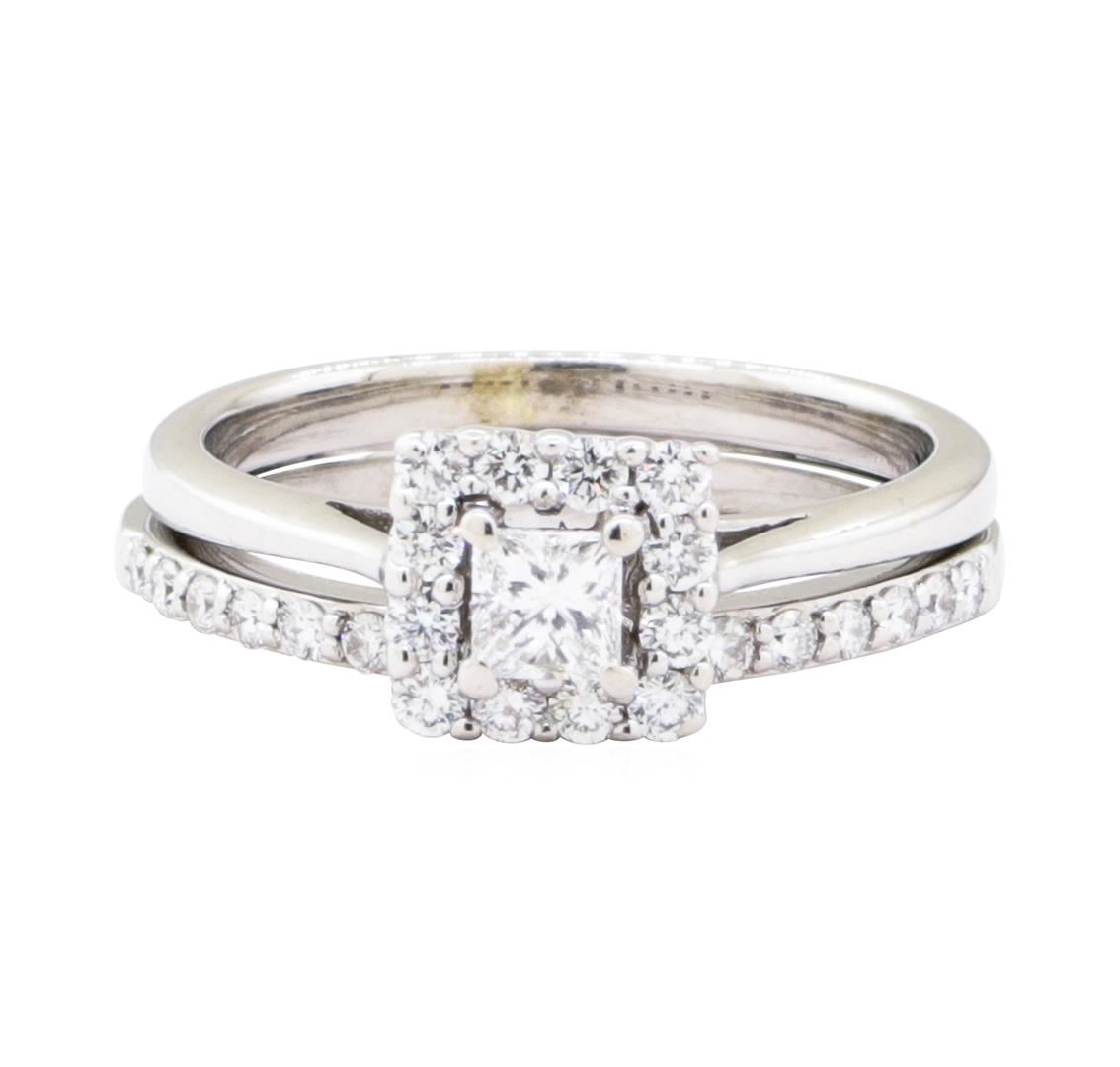 One set electronically tested 14KT white gold lady's combination cast & assembled wedding ring and attached band with a square cathedral basket halo with a bright polish finish. The featured lady's ring set has a double shank measuring 3.60 millimeters wide. Condition is Good. Containing: One prong set princess cut diamond, measuring 3.38 x 3.34 x 2.51mm (depth est.) , 3.00.%. GTCF approximate weight of 0.25ct. Graded in the setting. Color H Clarity VS-2 Cut Very Good Twelve prong set round brilliant cut diamonds, measuring 1.80 - 1.75 x 1.10mm (depth est.) approximate total weight of 12 Stones = 0.25ct. Graded in the setting. Color G - H Clarity VS-2 to SI-1 Cut Excellent Fourteen prong set round brilliant cut diamonds, measuring 1.50 - 1.45 x 0.92mm (depth est.) approximate total weight of 14 Stones = 0.17ct. Graded in the setting. Color H - I Clarity VS-2 to SI-1 Cut Very Good. Total Weight of Diamonds 0.67ct.. Total Weight of Ring And Attached Band 4.60gm GAS Appraised at $3535.00. GAS Appraised.