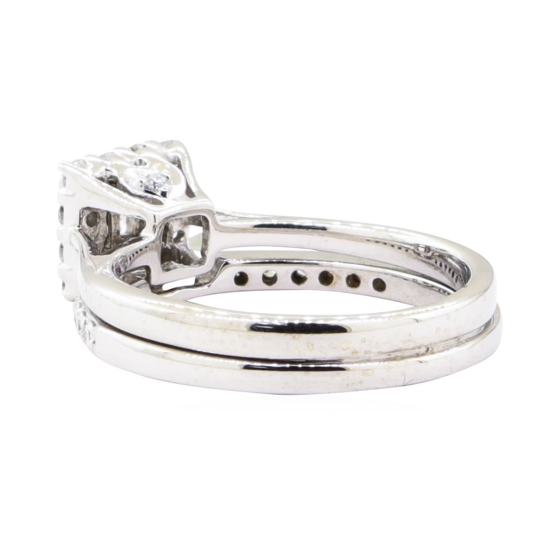 One set electronically tested 14KT white gold lady's combination cast & assembled wedding ring and attached band with a square cathedral basket halo with a bright polish finish. The featured lady's ring set has a double shank measuring 3.60 millimeters wide. Condition is Good. Containing: One prong set princess cut diamond, measuring 3.38 x 3.34 x 2.51mm (depth est.) , 3.00.%. GTCF approximate weight of 0.25ct. Graded in the setting. Color H Clarity VS-2 Cut Very Good Twelve prong set round brilliant cut diamonds, measuring 1.80 - 1.75 x 1.10mm (depth est.) approximate total weight of 12 Stones = 0.25ct. Graded in the setting. Color G - H Clarity VS-2 to SI-1 Cut Excellent Fourteen prong set round brilliant cut diamonds, measuring 1.50 - 1.45 x 0.92mm (depth est.) approximate total weight of 14 Stones = 0.17ct. Graded in the setting. Color H - I Clarity VS-2 to SI-1 Cut Very Good. Total Weight of Diamonds 0.67ct.. Total Weight of Ring And Attached Band 4.60gm GAS Appraised at $3535.00. GAS Appraised.