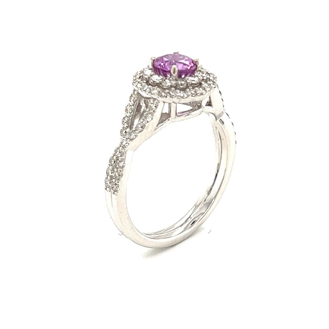 One electronically tested 14KT white gold lady's combination cast & assembled fashion ring with a double basket halo with a bright polish finish. Condition is new, good workmanship. The featured lady's ring has a cathedral crossover motif and a double shank measuring 2.60 millimeters in width. Identified with markings of "14K". Containing: One prong set round modified mixed cut natural pink sapphire, measuring 5.06 - 5.02 x 3.27 mm, (depth est.) approximate weight of 0.67ct., clarity is eye clean, medium, moderately strong, slightly purplish red color, (GIA slpR 5/4), cut is very good. Transmitting light with no distortion, transparent. Colored gemstones are presumed to have been subjected to commonly used enhancement processes. Graded in the setting. Sixty-eight prong set round brilliant cut diamonds, measuring 1.40 - 1.20 x 0.78mm (depth est.) approximate total weight of 68 Stones = 0.53ct. Graded in the setting. Color G - Clarity VS-2 to SI-1 Cut Very Good Total Weight of Colored Stones Total Weight of Diamonds Total Weight of Ring 0.67ct. 0.53ct. 4.00gm Appraisal No: 000022197002 Total Estimated Retail Value $ 4685.00