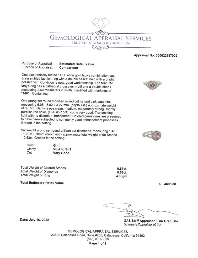 One electronically tested 14KT white gold lady's combination cast & assembled fashion ring with a double basket halo with a bright polish finish. Condition is new, good workmanship. The featured lady's ring has a cathedral crossover motif and a double shank measuring 2.60 millimeters in width. Identified with markings of "14K". Containing: One prong set round modified mixed cut natural pink sapphire, measuring 5.06 - 5.02 x 3.27 mm, (depth est.) approximate weight of 0.67ct., clarity is eye clean, medium, moderately strong, slightly purplish red color, (GIA slpR 5/4), cut is very good. Transmitting light with no distortion, transparent. Colored gemstones are presumed to have been subjected to commonly used enhancement processes. Graded in the setting. Sixty-eight prong set round brilliant cut diamonds, measuring 1.40 - 1.20 x 0.78mm (depth est.) approximate total weight of 68 Stones = 0.53ct. Graded in the setting. Color G - Clarity VS-2 to SI-1 Cut Very Good Total Weight of Colored Stones Total Weight of Diamonds Total Weight of Ring 0.67ct. 0.53ct. 4.00gm Appraisal No: 000022197002 Total Estimated Retail Value $ 4685.00