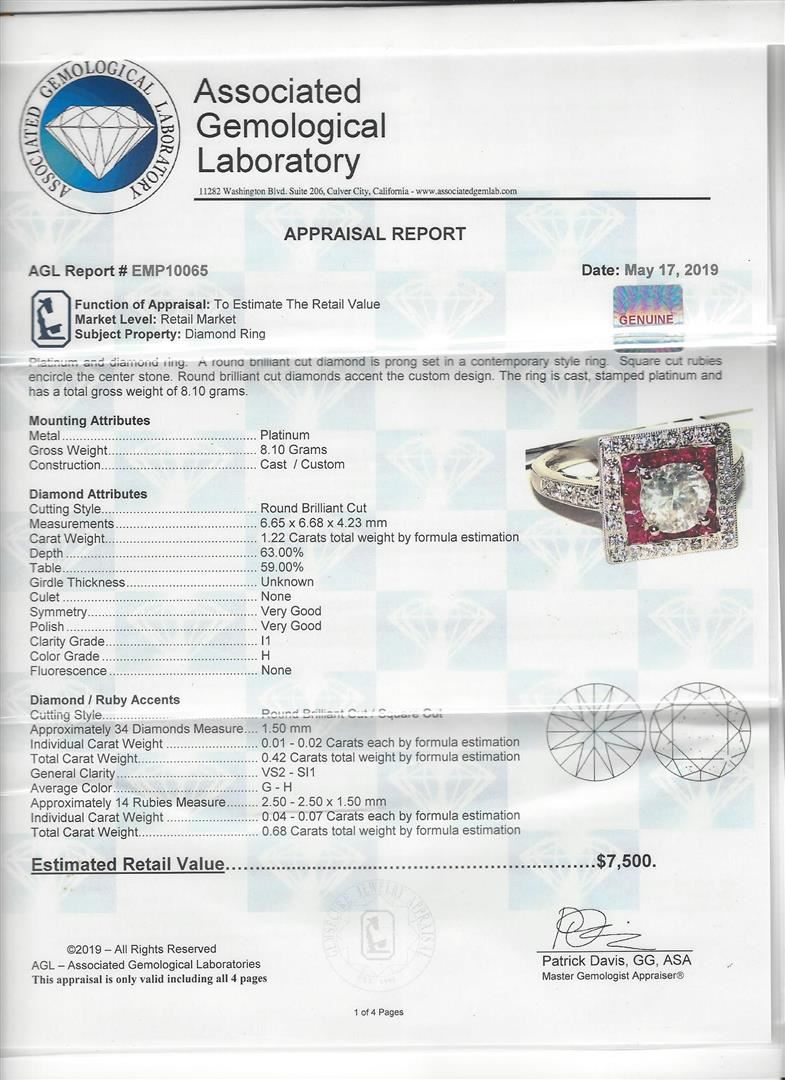 Platinum and diamond ring. A round cut diamond is prong set in a contemporary style ring. Square cut rubies encircle the center stone. Round brilliant cut diamonds accent the custom design. The ring is cast, stamped platinum and has a total gross weight of 8.10 grams. Mounting Attributes Metal: Platinum Gross Weight.: 8.10 Grams Construction: Cast /Custom Diamond Attributes Cutting Style: Round Brilliant Cut Measurements: 6.65 x 6.68 x 4.23 mm Carat Weight.:1.22 Carats total weight by formula estimation Depth:.63.00% Table:.59.00% Girdle Thickness: Unknown Culet: None Symmetry: Very Good Polish: Very Good Clarity Grade: I1 Color Grade: H Fluorescence: None Diamond I Ruby Accents Cutting Style: Round Brilliant Cut/ Square Cut Approximately 34 Diamonds Measure: 1.50 mm Individual Carat Weight: 0.01 - 0.02 Carats each by formula estimation Total Carat: 0.42 Carats total weight by formula estimation General: VS2 - SI1 Average: G - H Approximately 14 Rubies Measure: 2.50 - 2.50 x 1.50 mm Individual Carat Weight : 0.04 - 0.07 Carats each by formula estimation Total Carat Weight: 0.68 Carats total weight by formula estimation Estimated Retail Value: $7,500