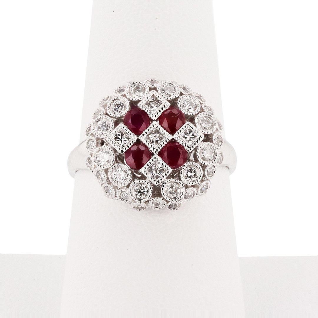 DESCRIPTION: ONE PLATINUM LADY'S CUSTOM MADE DIAMOND & RUBY RING. 8.00 GR TW. CONTAINING: 1 â€" MAIN CENTER GEMSTONE(S): IDENTITY : ALL DIAMONDS SET IN BEZEL SETTING STYLE. CARAT WEIGHT : 0.70 CT. SHAPE & MEASUREMEMT : ROUND & PRINCESS BRILLIANT CUT. APPROX : 1.75 MM. QUALITY : SI CLARITY , H/I COLOR. 2 â€" ADJACENT GEMSTONES: IDENTITY : NATURAL RUBIES. SHAPE : ROUND BRILLIANT CUT. 4 COUNTS. CARAT WEIGHT : 0.66 CT TW. QUALITY : FINE DEEP RED COLOR. ALL FINE CUTTING AND PROPORTIONS. ALL BEZEL & CHANNEL SETTINGS STYLE. TOTAL GEMSTONES WEIGHT : 1.36 CTS TW. #LREF-3112