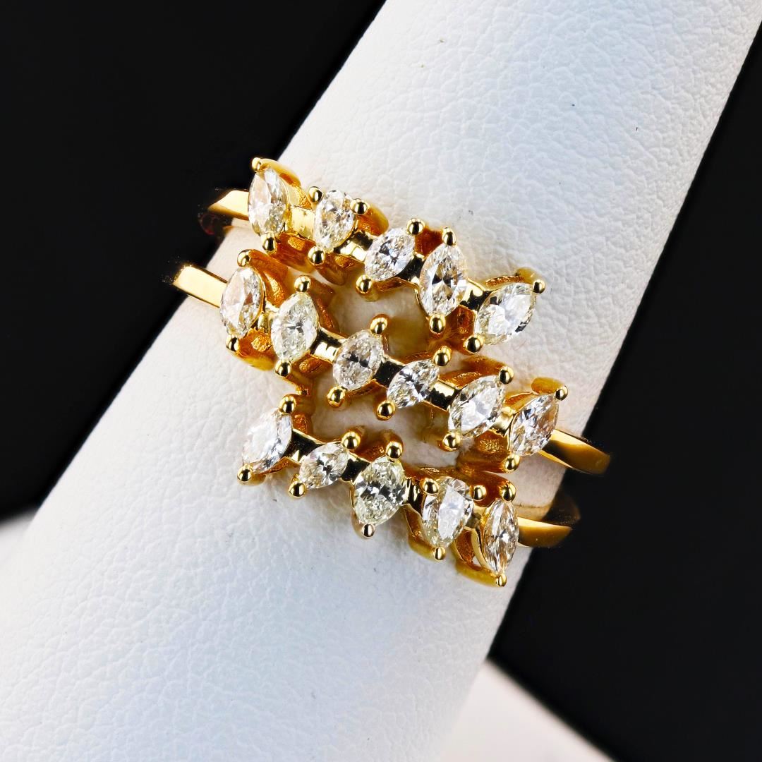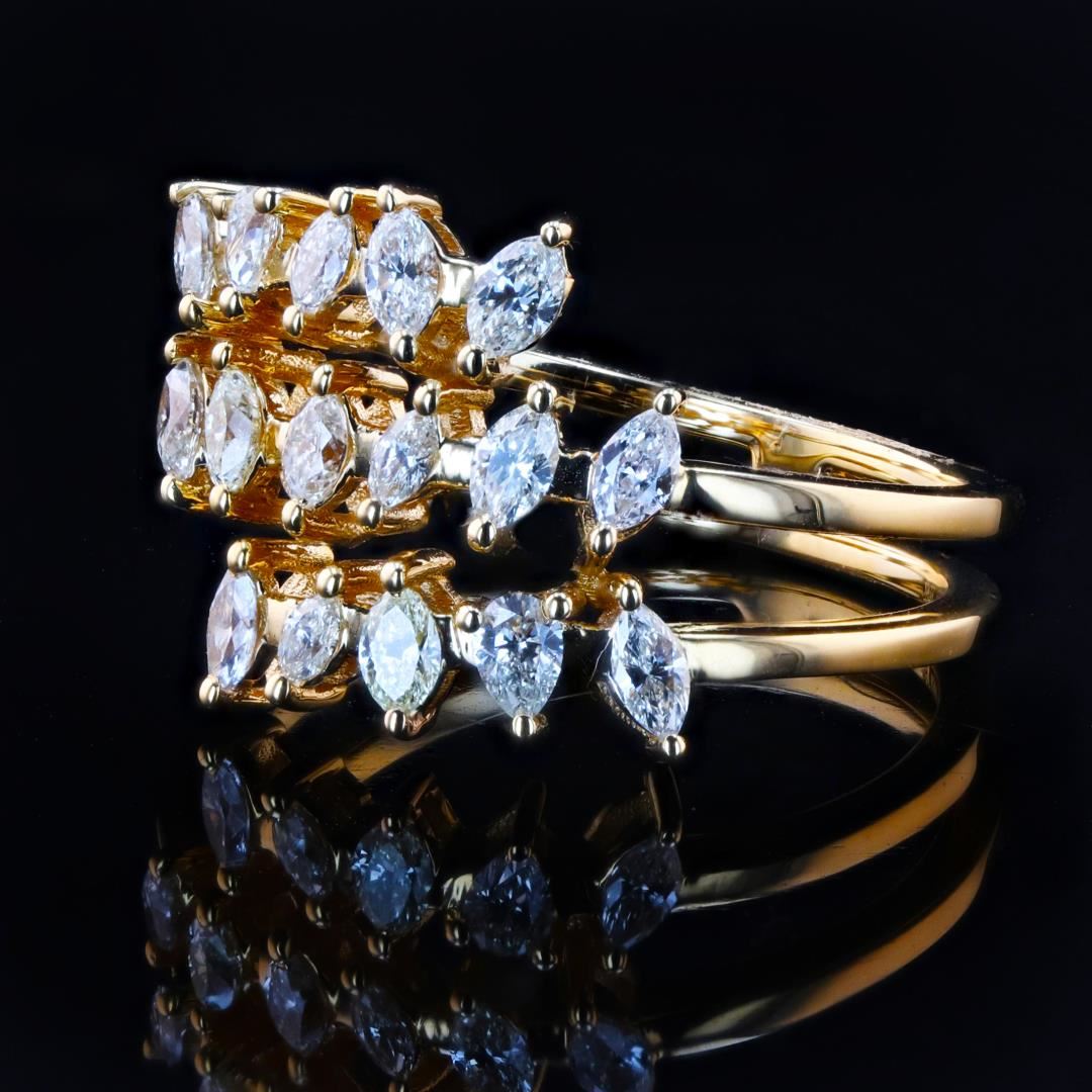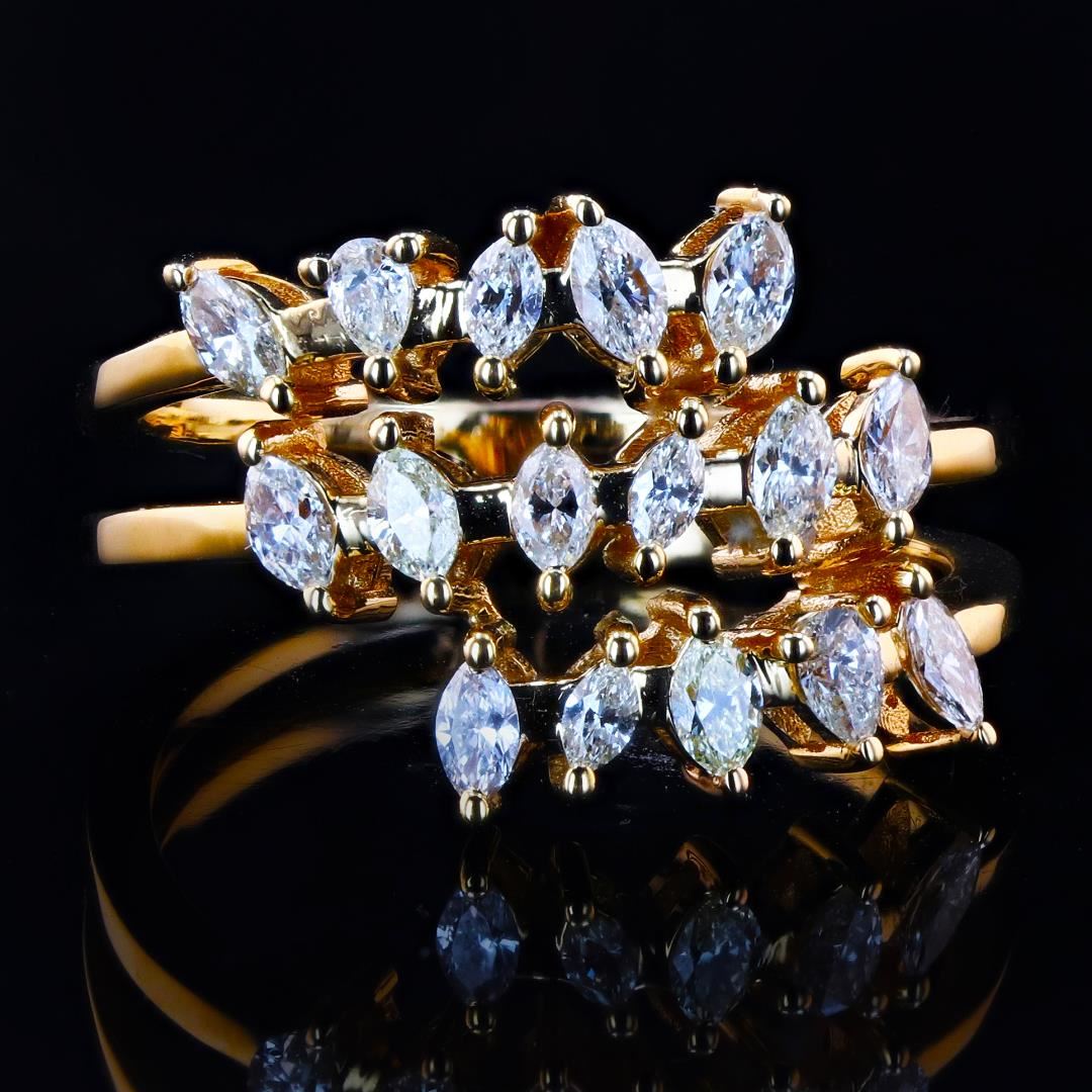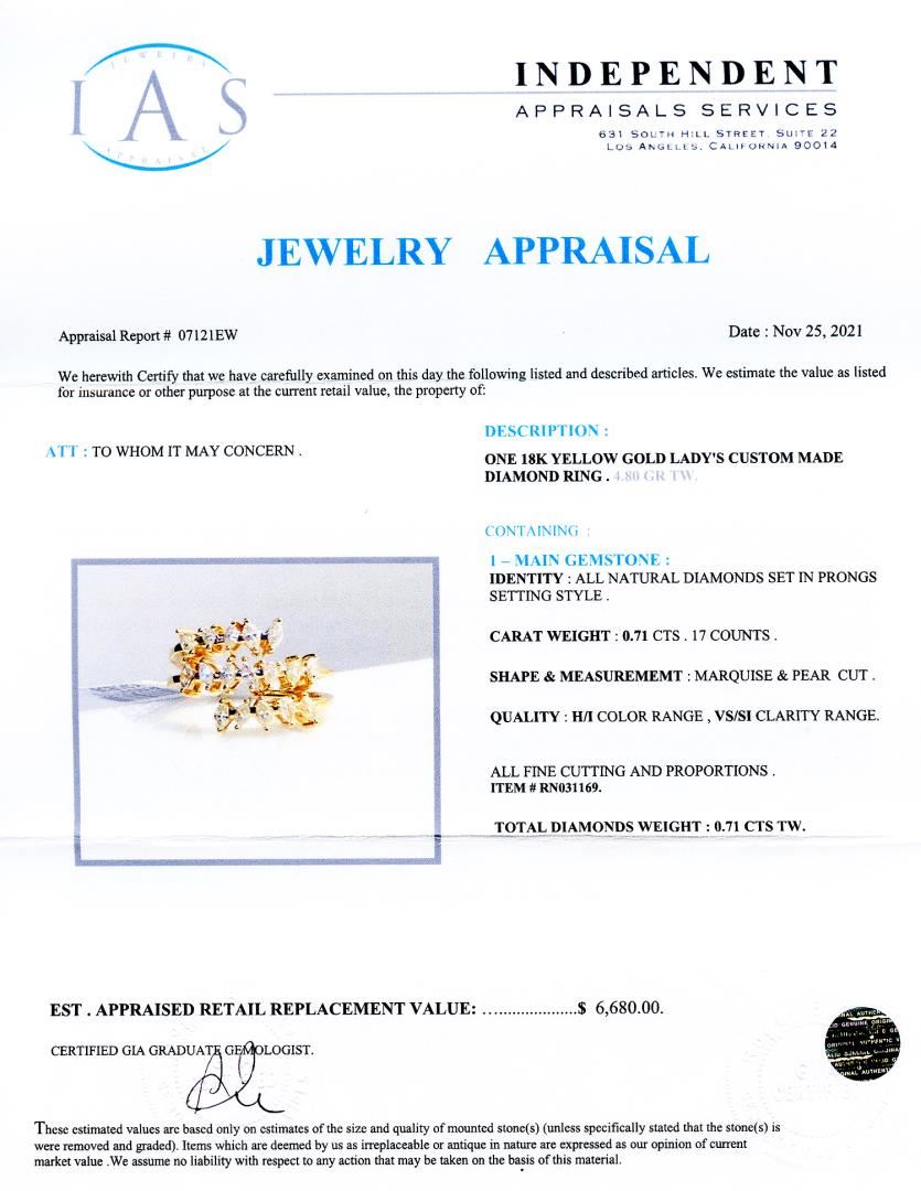 ONE 18K YELLOW GOLD LADY'S CUSTOM MADE DIAMOND RING . 4.80 GR TW #I â€" MAIN GEMSTONE# IDENTITY : ALL NATURAL DIAMONDS SET IN PRONGS SETTING STYLE CARAT WEIGHT : 0.71 CTS, 17 COUNTS SHAPE & MEASUREMEMT : MARQUISE and PEAR CUT #QUALITY# COLOR RANGE: H/I CLARITY RANGE: VS/SI ALL FINE CUTTING AND PROPORTIONS TOTAL DIAMONDS WEIGHT : 0.71 CTS TW. #LREF-2917