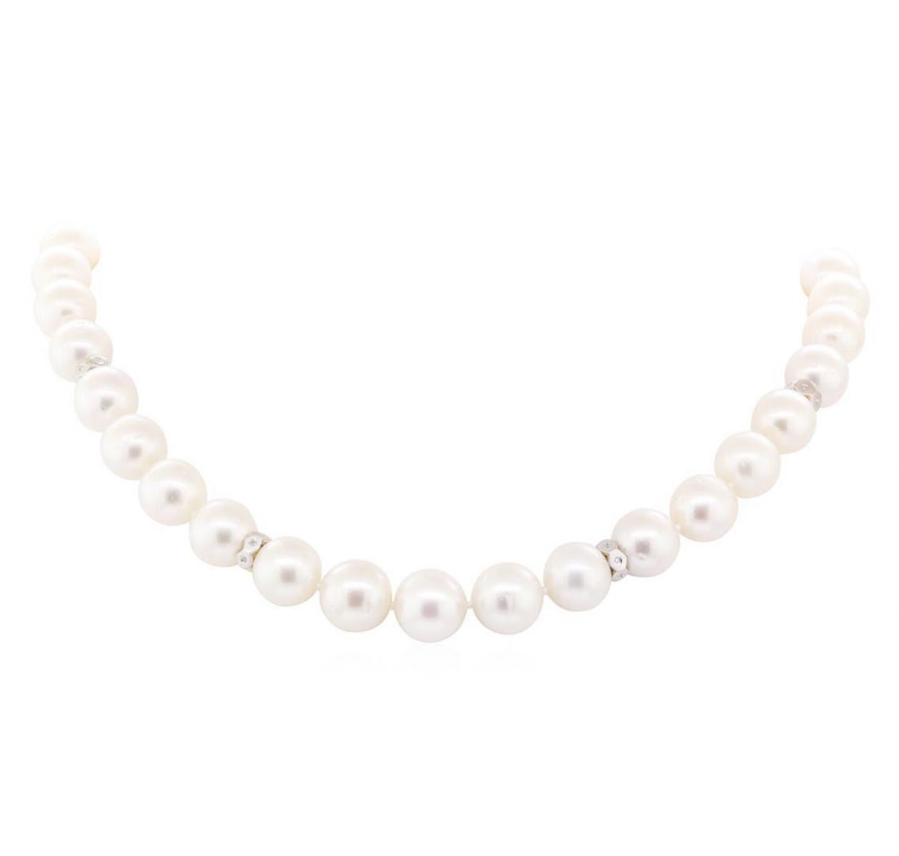 One graduated single strand pearl necklace 18.0' princess length, knotted with a tongue clasp & foldover safety containing 33 south sea cultured pearls, 12.0mm to 14.2mm in size. The pearls are white in color with a good luster, near round, and lightly blemished with excellent matching. The featured pearl necklace has a 14KT white gold rectangular art deco motif clasp and rondels. Graded on the strand.South Sea cultured pearls are farmed in the oceans surrounding Australia, Indonesia, the Philippines and the southern coast of China. The main source of Australian South Sea pearls lies in the northwest on the Kimberly coast. South Sea cultured pearls are formed in the Pinctada Maxima oyster. These pearls take between two to three years to grow and have a unique nacre due to the fast moving and clean waters of the South Seas. Three bezel set round brilliant cut diamonds, measuring 2.20 - 2.00 x 1.30mm (depth est.) approximate total weight of 3 Stones = 0.11ct. Graded in the setting. Color H - I Clarity VS-2 to SI-1 Cut Very Good One Hundred Four prong set single cut diamonds, measuring 1.20 - 1.10 x 0.71mm (depth est.) approximate total weight of 104 Stones = 0.60ct. Graded in the setting. Color G - H Clarity VS-2 to SI-2 Cut Good. Total Weight of Diamonds 0.71ct.. Total Weight of 111.40gm GAS Appraised at $22730.00. GAS Appraised.