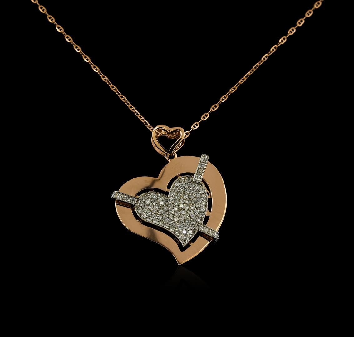 One electronically tested 14KT rose gold lady's combination cast & assembled fashion heart shape pendant & chain 18.0' long, 1.3mm diamond cut anchor link with a lobster claw clasp with a bright polish finish. Identified with markings of '14K'. Condition is new, good workmanship. Containing: Ninety-Six prong set round brilliant cut diamonds, measuring 1.35 - 1.20 x 0.77mm (depth est.) approximate total weight of 96 Stones = 0.72ct. Graded in the setting. Clarity SI-1 to SI-2. Color: H - I Cut Good. Total Weight of Diamonds 0.72ct.. Total Weight of Pendant & Chain 7.90gm. GAS Appraised.