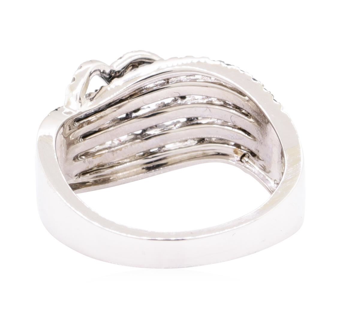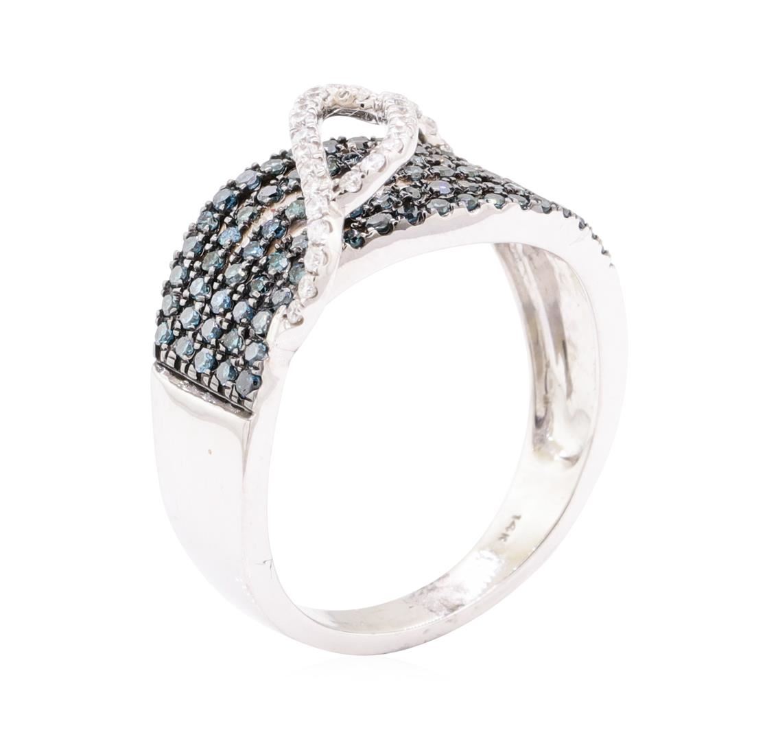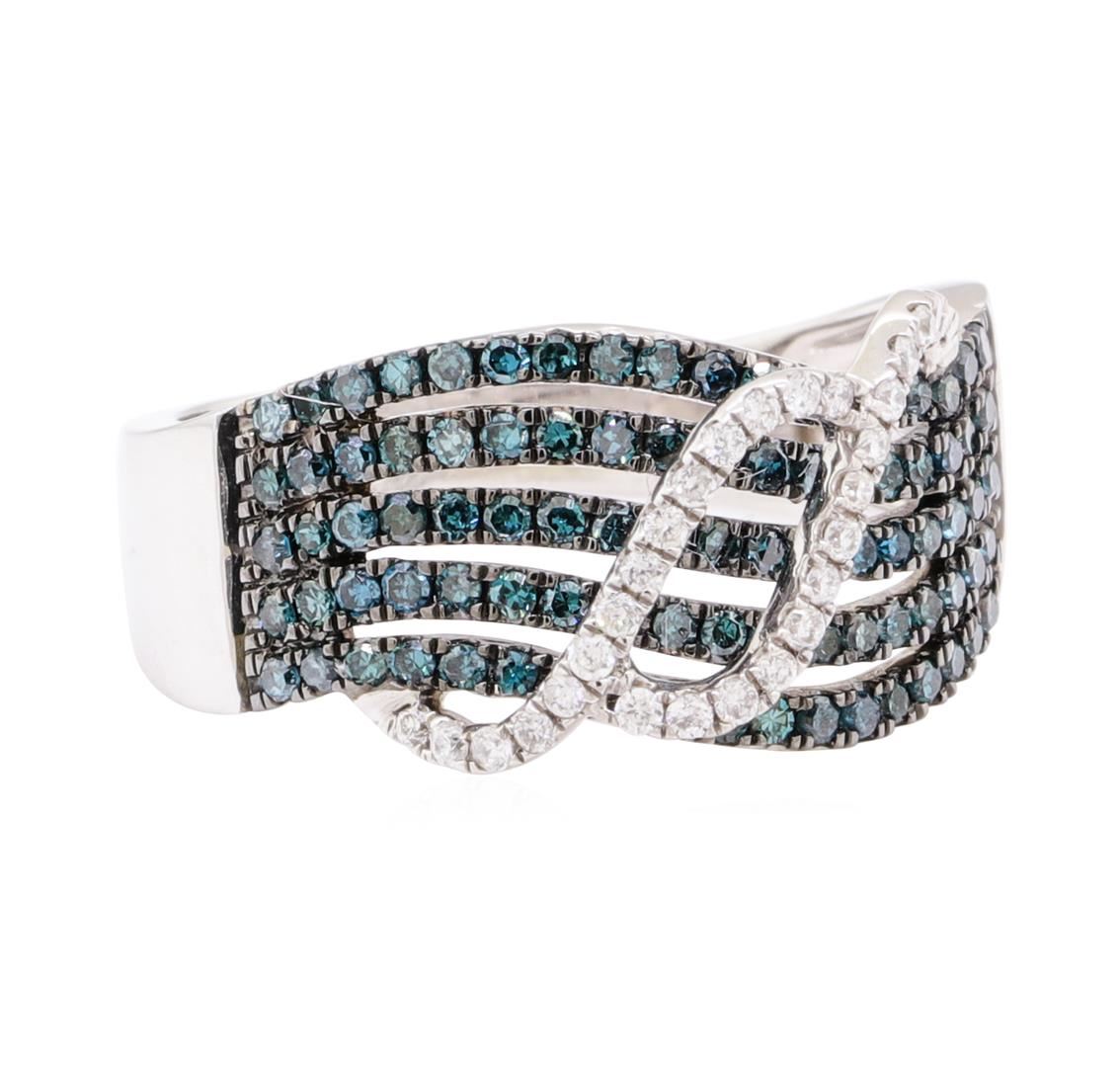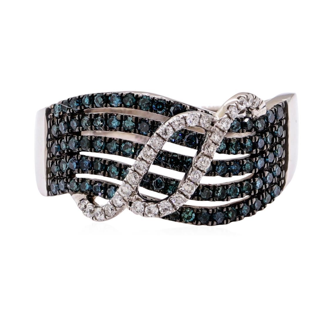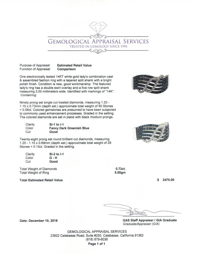 One electronically tested 14KT white gold lady's combination cast & assembled fashion ring with a tapered split shank with a bright polish finish. The featured lady's ring has a double swirl overlay and a five row split shank measuring 3.00 millimeters wide. Identified with markings of '14K'. Condition is new, good workmanship. Containing: Ninety prong set single cut treated diamonds, measuring 1.20 - 1.15 x 0.73mm (depth est.) approximate total weight of 90 Stones = 0.58ct. Colored gemstones are presumed to have been subjected to commonly used enhancement processes. Graded in the setting. The colored diamonds are set in place with black rhodium prongs. Color Fancy Dark Greenish Blue Clarity SI-1 to I-1 Cut Good Twenty-Eight prong set round brilliant cut diamonds, measuring 1.20 - 1.10 x 0.69mm (depth est.) approximate total weight of 28 Stones = 0.15ct. Graded in the setting. Color G - H Clarity SI-2 to I-1 Cut Good. Total Weight of Diamonds 0.73ct.. Total Weight of Ring 5.00gm GAS Appraised at $2470.00. GAS Appraised.