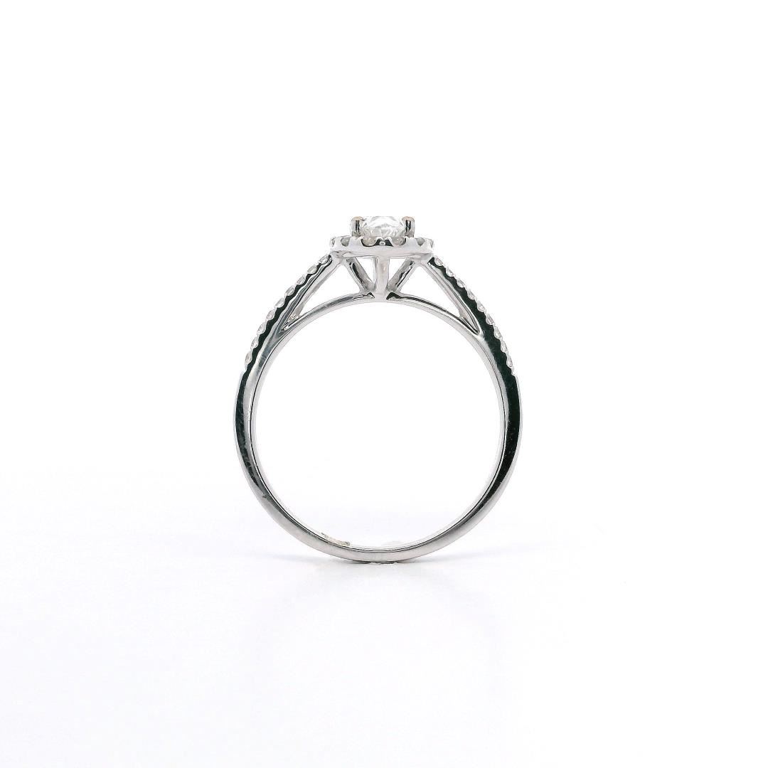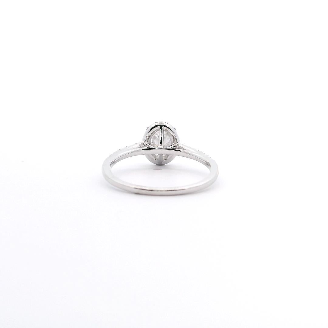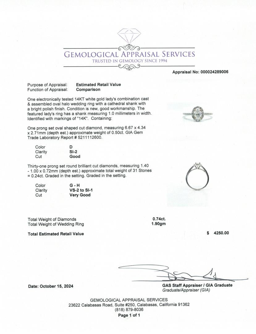 This 0.74 ctw diamond halo wedding ring in 14KT white gold is designed with a delicate yet captivating style, featuring a 0.50ct oval diamond with SI-2 clarity as the centerpiece. Surrounded by 31 round brilliant diamonds weighing 0.24ct, this ring radiates a graceful charm that will capture attention without overpowering. It's ideal for the bride seeking subtle elegance with a touch of sparkle.