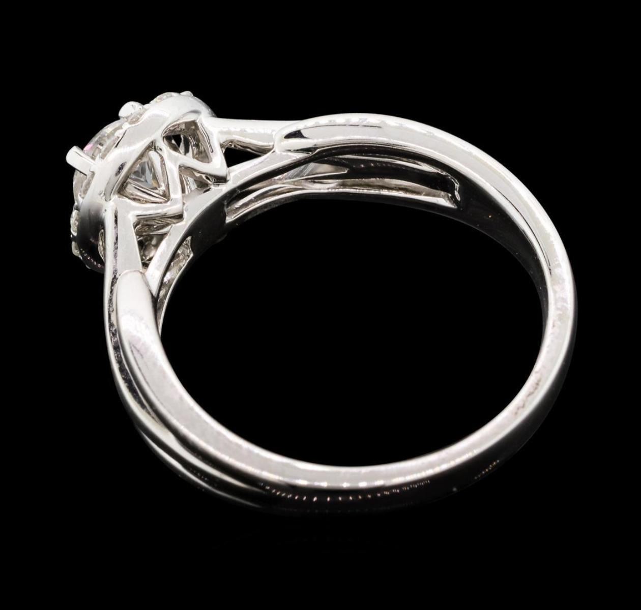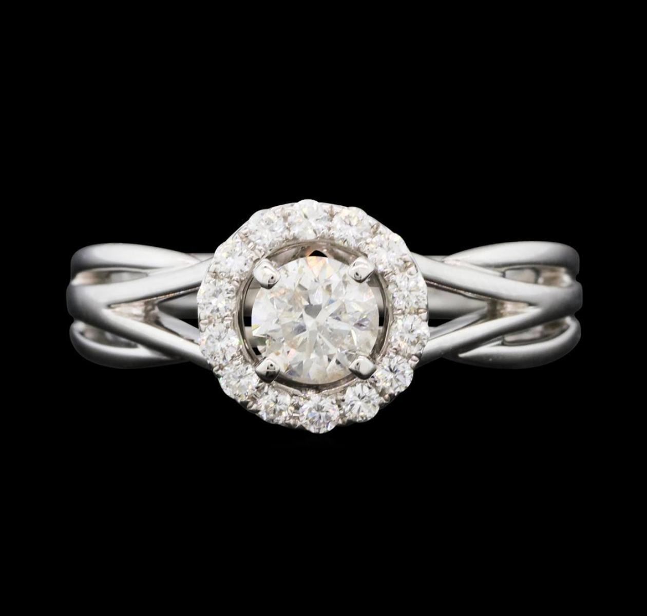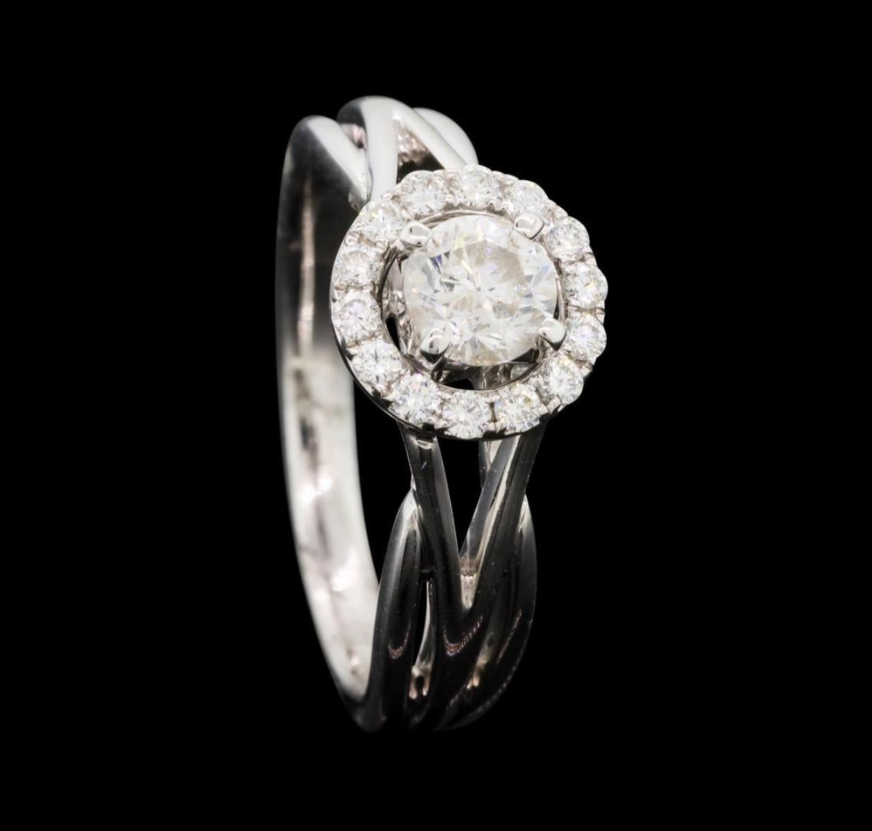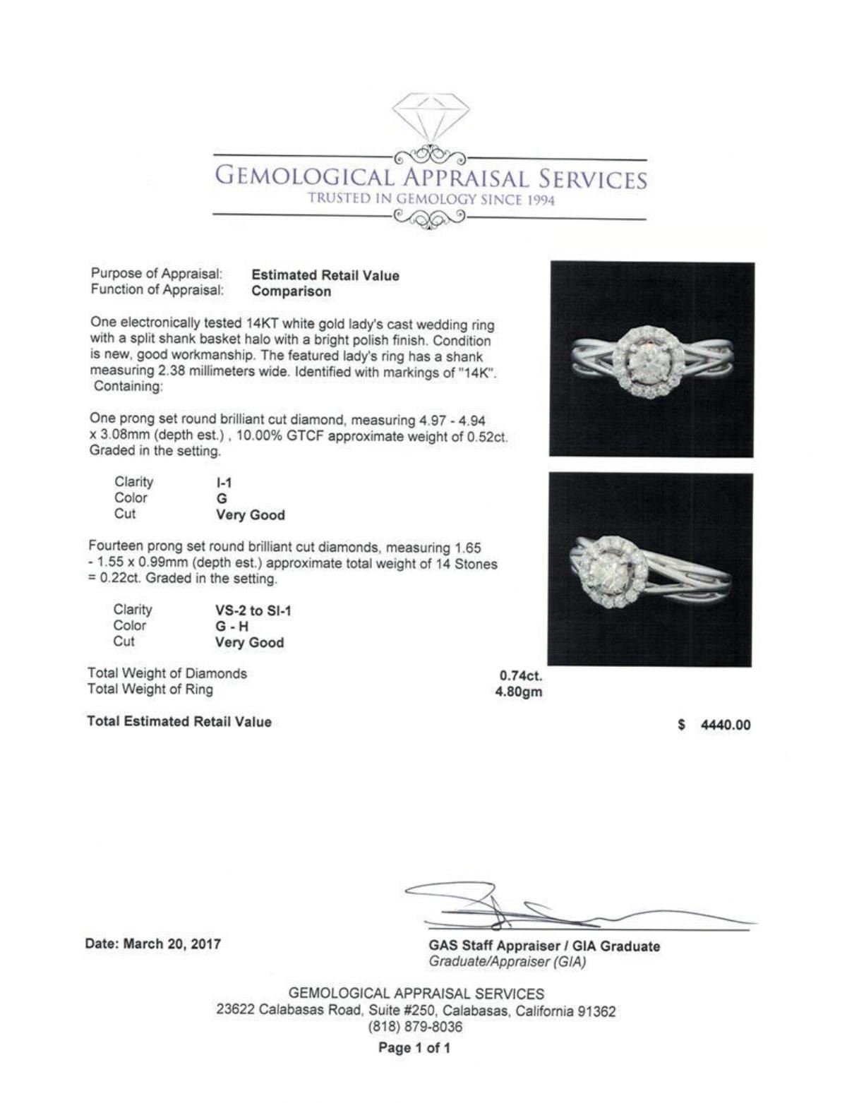 One electronically tested 14KT white gold lady's cast wedding ring with a split shank basket halo with a bright polish finish. The featured lady's ring has a shank measuring 2.38 millimeters wide. Identified with markings of '14K'. Condition is new, good workmanship. Containing: One prong set round brilliant cut diamond, measuring 4.97 - 4.94 x 3.08mm (depth est.) , 10.00.%. GTCF approximate weight of 0.52ct. Graded in the setting. Color G Clarity I-1 Cut Very Good Fourteen prong set round brilliant cut diamonds, measuring 1.65 - 1.55 x 0.99mm (depth est.) approximate total weight of 14 Stones = 0.22ct. Graded in the setting. Color G - H Clarity VS-2 to SI-1 Cut Very Good. Total Weight of Diamonds 0.74ct.. Total Weight of Ring 4.80gm GAS Appraised.