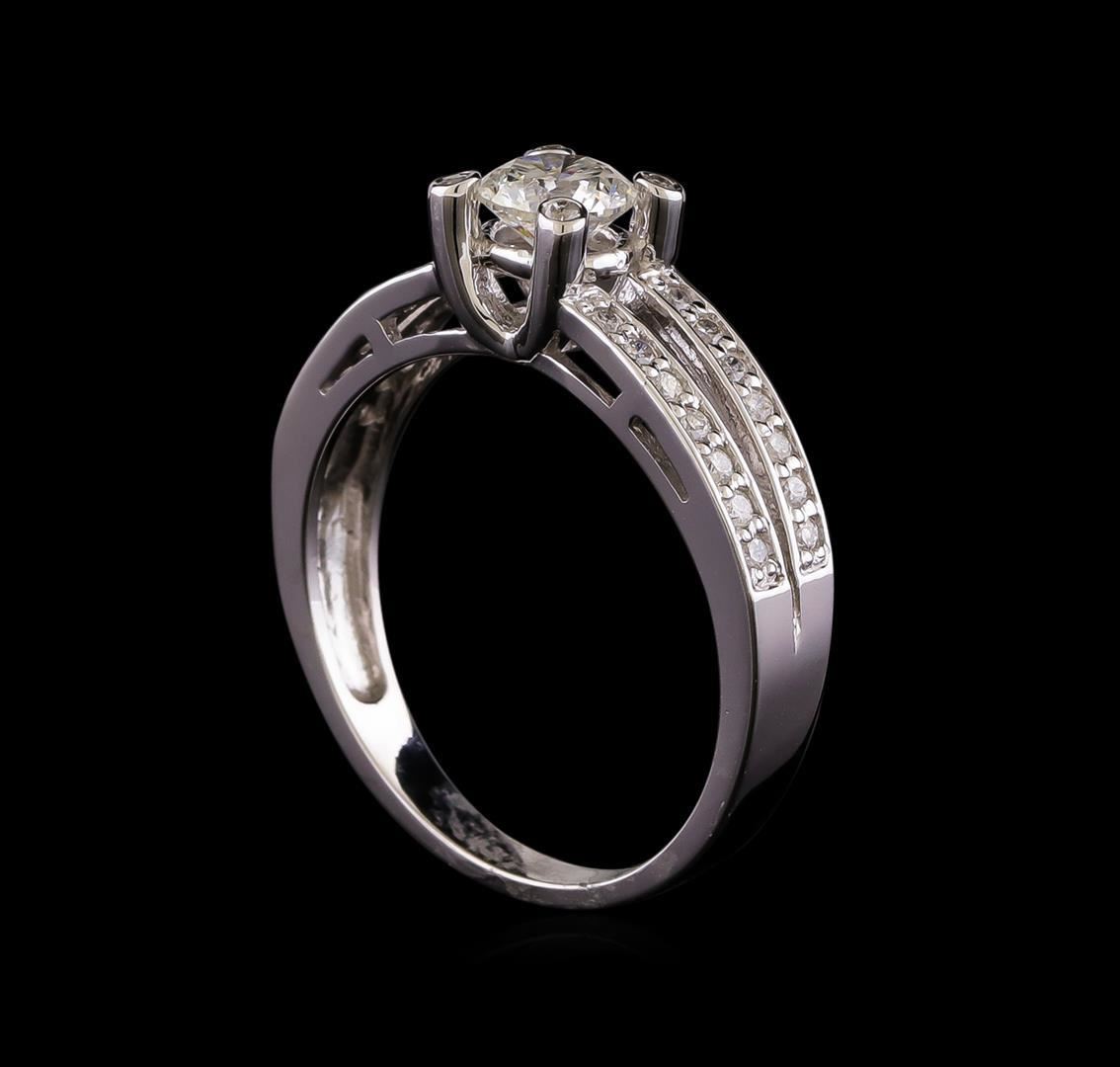 One electronically tested 14KT white gold lady's cast wedding ring with a split shank with a bright polish finish. The featured lady's ring has a shank measuring 2.26 millimeters wide. Identified with markings of '585'. Condition is new, good workmanship. Containing: One prong set round brilliant cut diamond, measuring 4.99 - 4.97 x 3.14mm (depth est.) , 4.00.%. GTCF approximate weight of 0.50ct. Graded in the setting. Clarity I-1. Color: H Cut Good Twenty-Eight prong set round brilliant cut diamonds, measuring 1.30 - 1.20 x 0.78mm (depth est.) approximate total weight of 28 Stones = 0.22ct. Graded in the setting. Clarity SI-1 to SI-2. Color: H - I Cut Good Four bezel set round brilliant cut diamonds, measuring 1.10 - 1.00 x 0.65mm (depth est.) approximate total weight of 4 Stones = 0.02ct. Graded in the setting. Clarity SI-1 to I-1. Color: H - I Cut Good. Total Weight of Diamonds 0.74ct.. Total Weight of Ring 3.30gm. GAS Appraised.