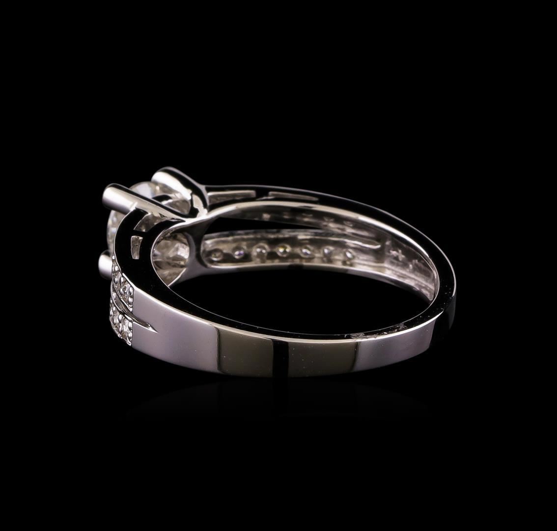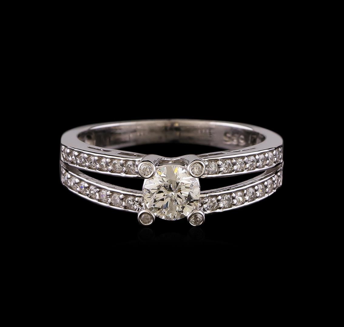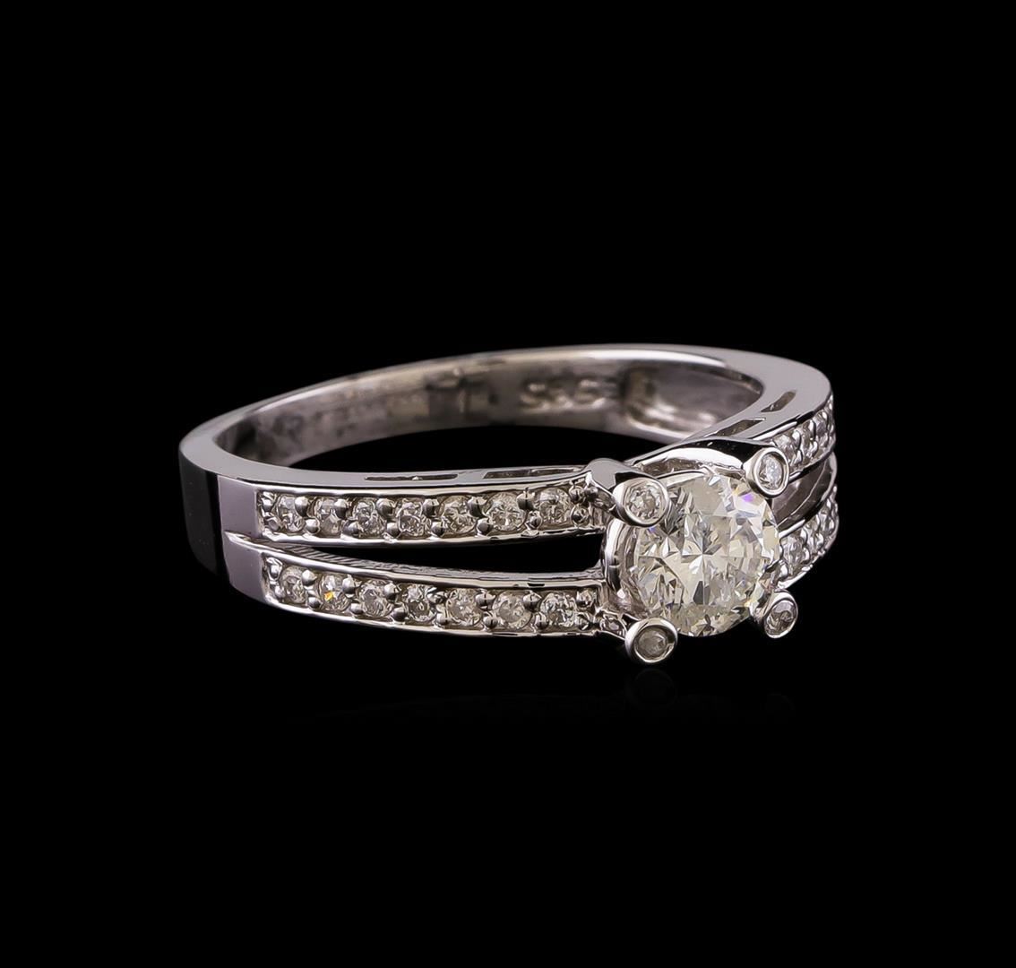 One electronically tested 14KT white gold lady's cast wedding ring with a split shank with a bright polish finish. The featured lady's ring has a shank measuring 2.26 millimeters wide. Identified with markings of '585'. Condition is new, good workmanship. Containing: One prong set round brilliant cut diamond, measuring 4.99 - 4.97 x 3.14mm (depth est.), 4.00.%. GTCF approximate weight of 0.50 ct. Graded in the setting. Clarity I-1. Color: H Cut Good Twenty-Eight prong set round brilliant cut diamonds, measuring 1.30 - 1.20 x 0.78mm (depth est.) approximate total weight of 28 Stones = 0.22ct. Graded in the setting. Clarity SI-1 to SI-2. Color: H - I Cut Good Four bezel set round brilliant cut diamonds, measuring 1.10 - 1.00 x 0.65mm (depth est.) approximate total weight of 4 Stones = 0.02ct. Graded in the setting. Clarity SI-1 to I-1. Color: H - I Cut Good. Total Weight of Diamonds 0.74ct.. Total Weight of Ring 3.30gm. GAS Appraised.