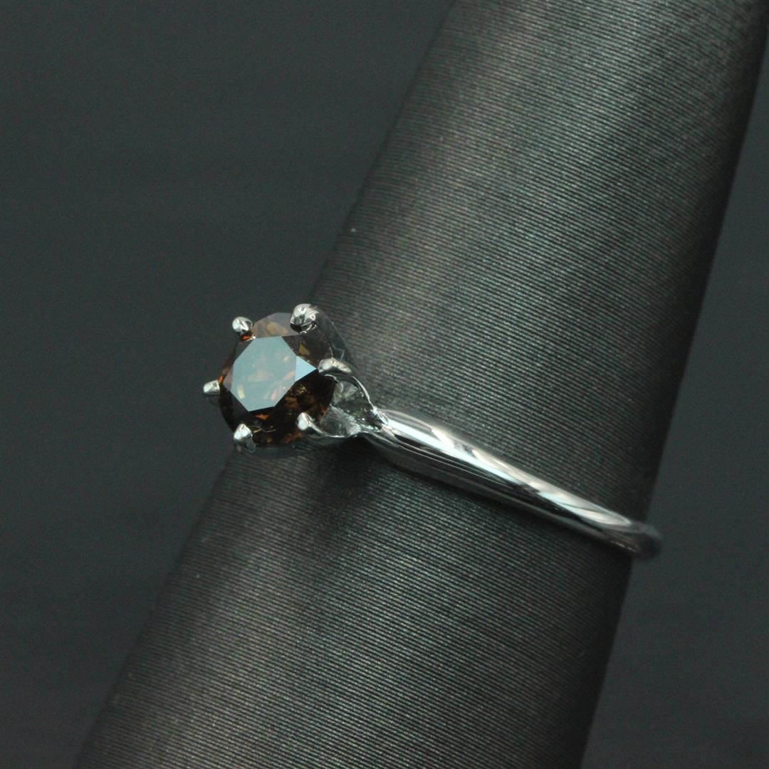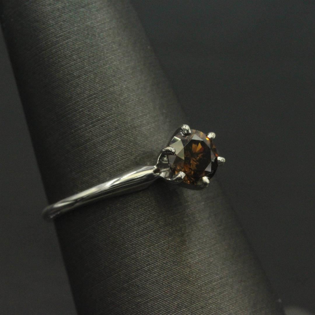 One lady's solitaire ring featuring: 14KT white gold weighing 1.77 grams containing one diamond weighing 0.74ct. The diamond is round brilliant cut and cognac in color with VS2 clarity and excellet cut. The ring is a size 6 but can be resized.