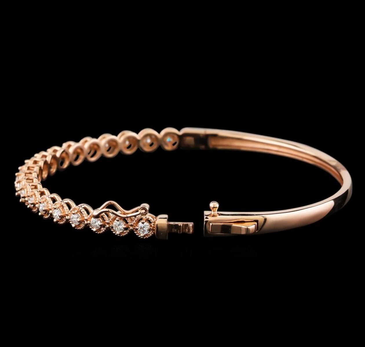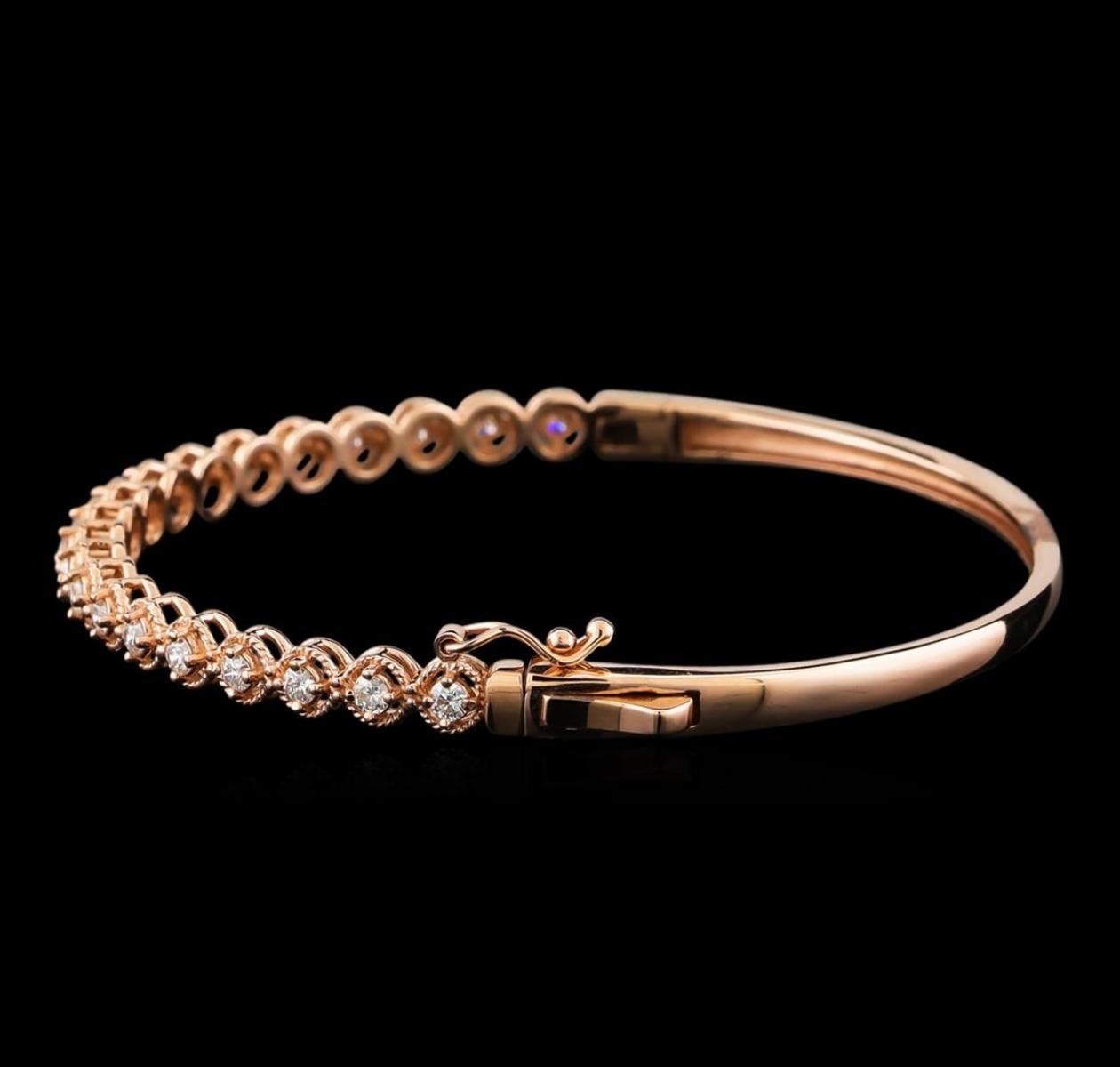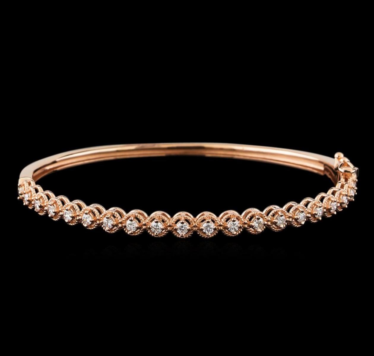 One electronically tested 14KT rose gold lady's combination cast & assembled fashion bracelet with a tongue clasp with foldover safety with a bright polish finish. The featured lady's bracelet has a circumference of approximately 7 inches. Identified with markings of "K14". Condition is new, good workmanship. Containing: Twenty prong set round brilliant cut diamonds, measuring 2.20 - 2.10 x 1.33mm (depth est.) approximate total weight of 20 Stones = 0.75ct. Graded in the setting. Clarity: SI-1 to SI-2. Color: H - I. Cut Good. Total Weight of Diamonds 0.75ct. Total Weight of Bracelet 10.70gm. GAS Appraised at $3,440.00.