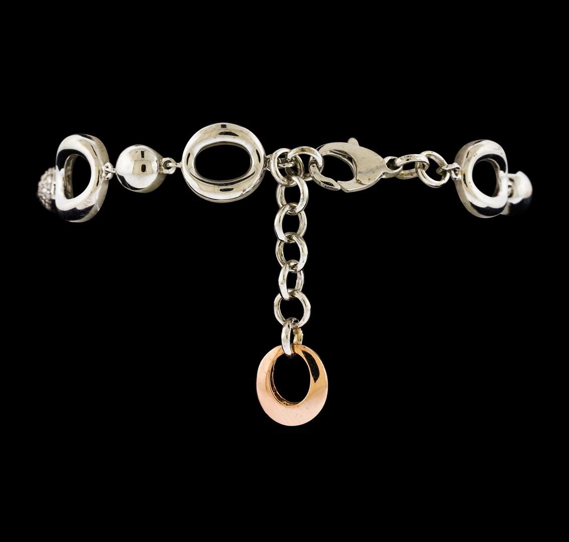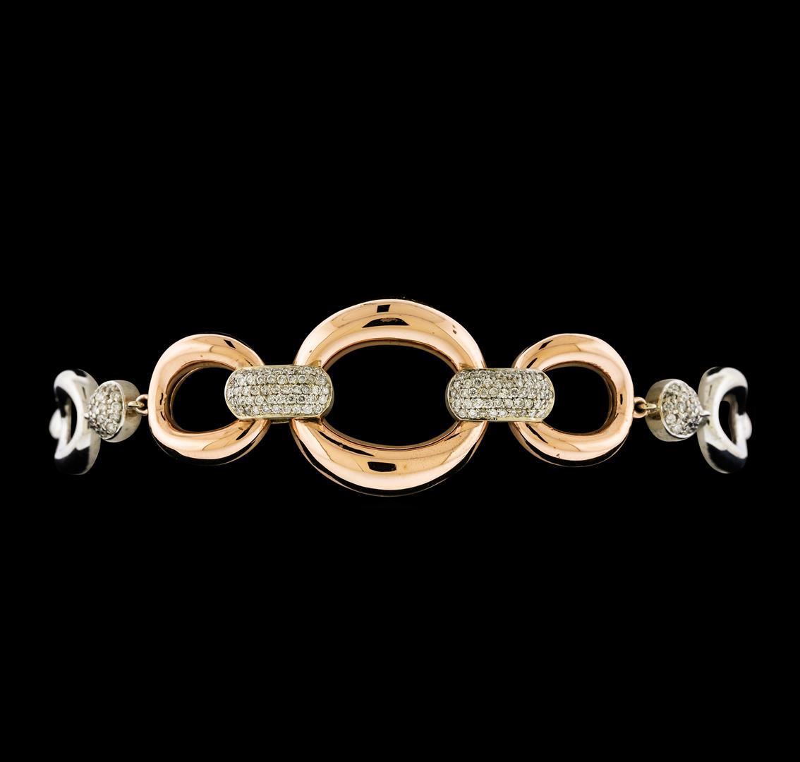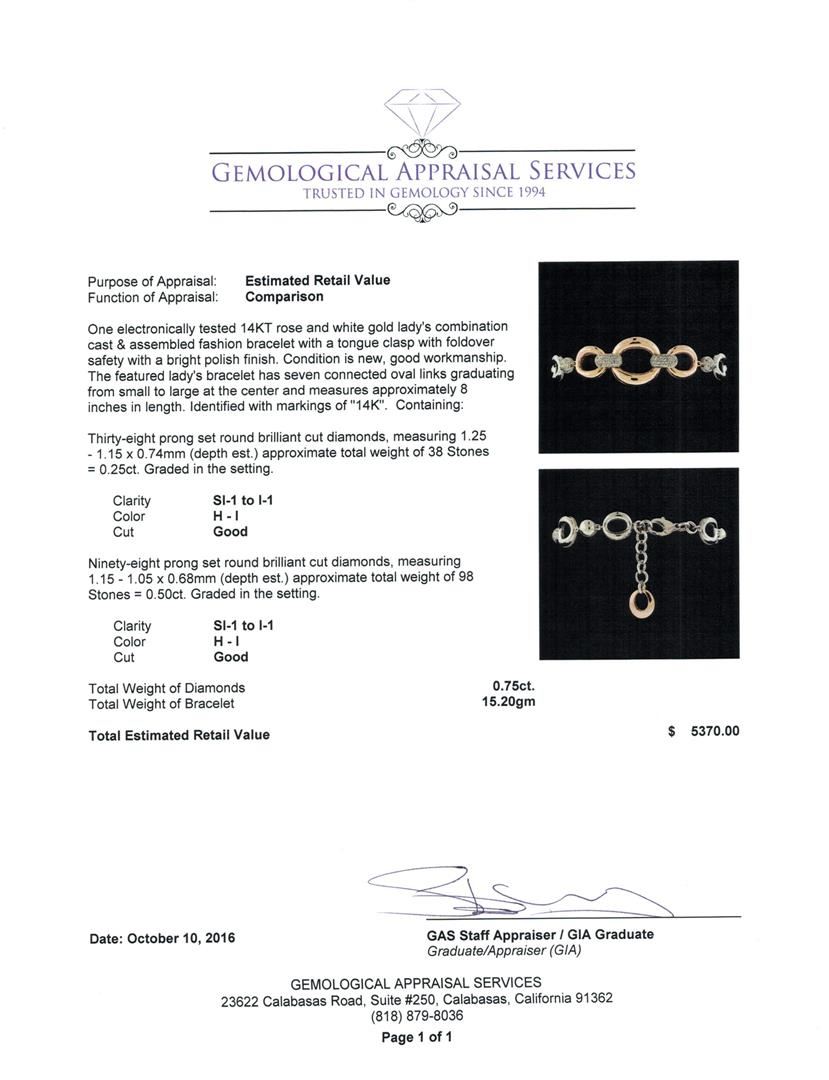 One electronically tested 14KT rose and white gold lady's combination cast & assembled fashion bracelet with a tongue clasp with foldover safety with a bright polish finish. The featured lady's bracelet has seven connected oval links graduating from small to large at the center and measures approximately 8 inches in length. Identified with markings of '14K'. Condition is new, good workmanship. Containing: Thirty-Eight prong set round brilliant cut diamonds, measuring 1.25 - 1.15 x 0.74mm (depth est.) approximate total weight of 38 Stones = 0.25ct. Graded in the setting. Clarity SI-1 to I-1. Color: H - I Cut Good Ninety-Eight prong set round brilliant cut diamonds, measuring 1.15 - 1.05 x 0.68mm (depth est.) approximate total weight of 98 Stones = 0.50ct. Graded in the setting. Clarity SI-1 to I-1. Color: H - I Cut Good. Total Weight of Diamonds 0.75ct.. Total Weight of Bracelet 15.20gm. GAS Appraised.