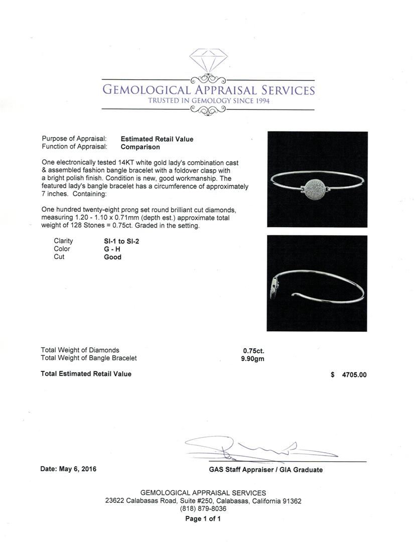 One electronically tested 14KT white gold lady's combination cast & assembled fashion bangle bracelet with a foldover clasp with a bright polish finish. The featured lady's bangle bracelet has a circumference of approximately 7 inches. Condition is new, good workmanship. Containing: One Hundred Twenty-Eight prong set round brilliant cut diamonds, measuring 1.20 - 1.10 x 0.71mm (depth est.) approximate total weight of 128 Stones = 0.75ct. Graded in the setting. Clarity: SI-1 to SI-2. Color: G - Good. Total Weight of Diamonds 0.75ct. Total Weight of Bangle Bracelet 9.90gm GAS Appraised.