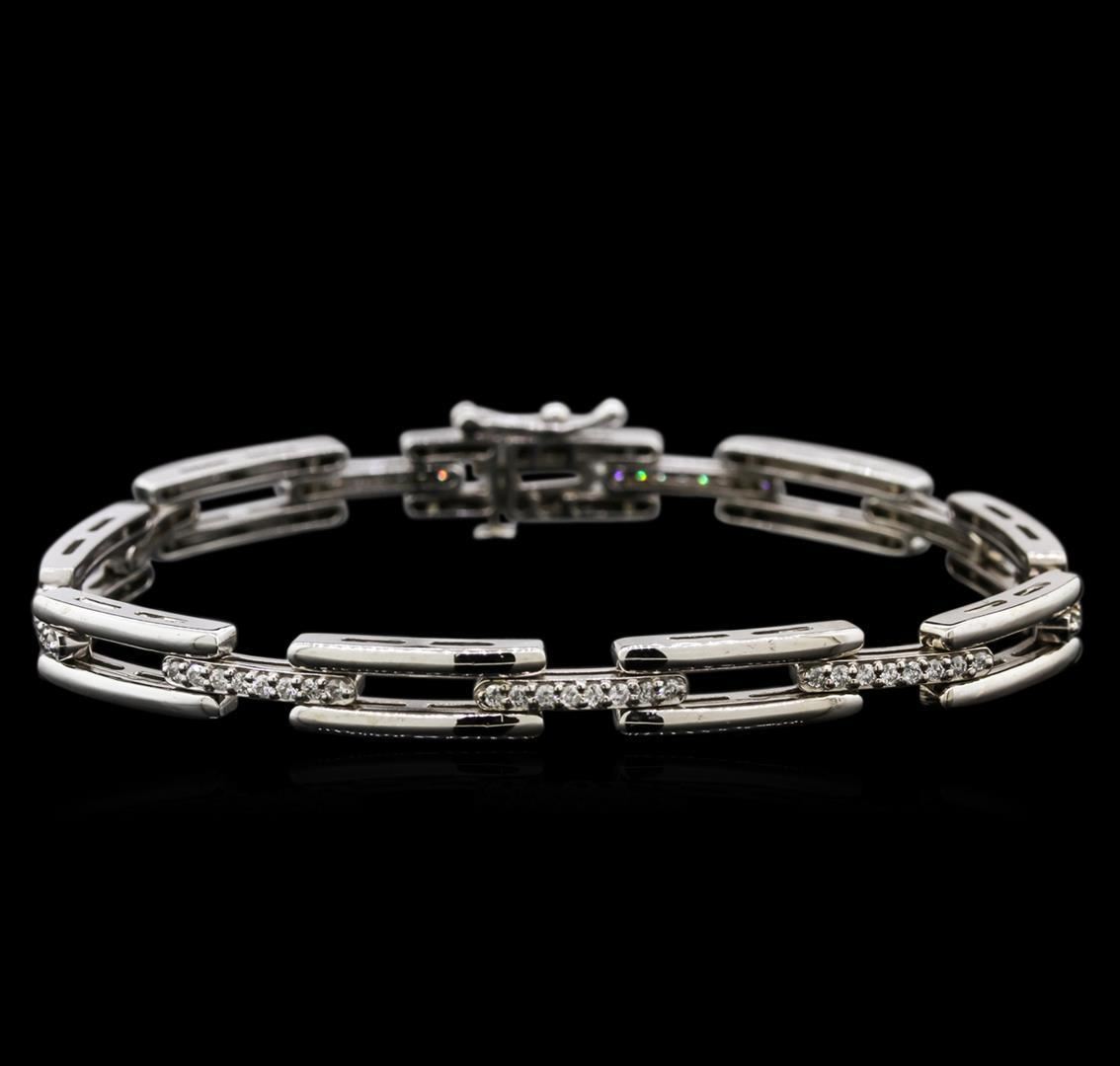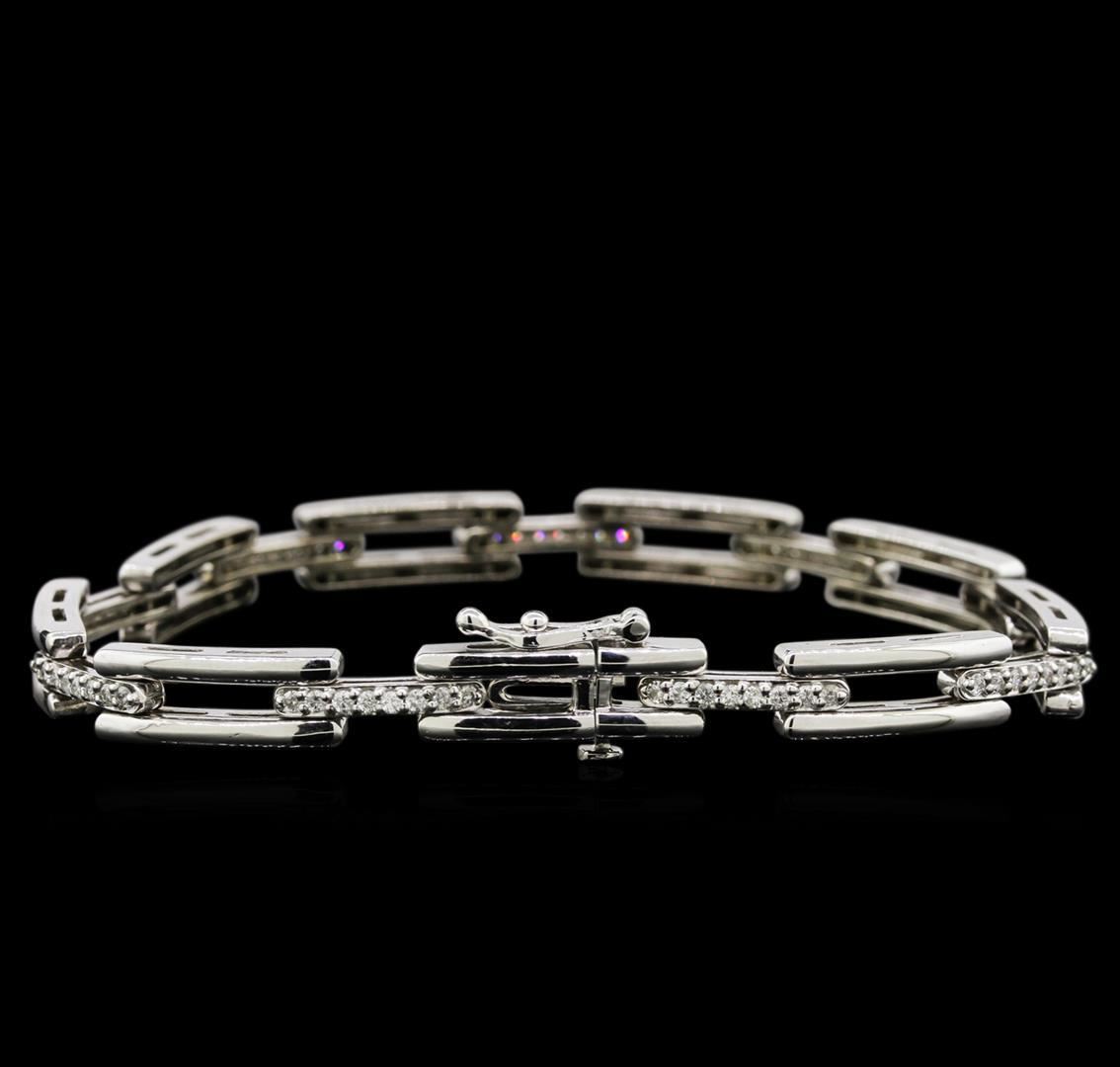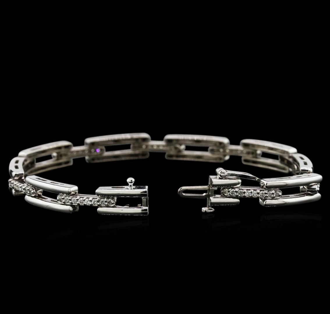 One electronically tested 14KT white gold lady's combination cast & assembled fashion bracelet with a tongue clasp with foldover safety with a bright polish finish. The featured lady's bracelet measures approximately 7 inches in length. Identified with markings of "14K". Condition is new, good workmanship. Containing: Seventy-Two prong set round brilliant cut diamonds, measuring 1.40 - 1.35 x 0.88mm (depth est.) approximate total weight of 72 Stones = 0.75ct. Graded in the setting. Clarity: SI-1 to I-1. Color: G - I. Cut Good. Total Weight of Diamonds 0.75ct. Total Weight of Bracelet 16.70gm. GAS Appraised.