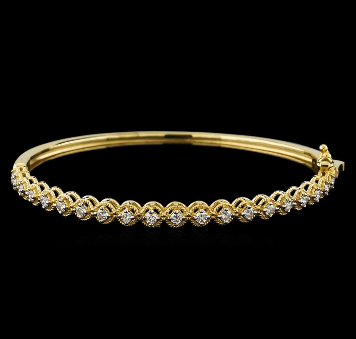 One electronically tested 14KT yellow gold lady's combination cast & assembled fashion bracelet with a tongue clasp with foldover safety with a bright polish finish. The featured lady's bracelet has a circumference of approximately 7 inches. Identified with markings of "K14". Condition is new, good workmanship. Containing: Twenty prong set round brilliant cut diamonds, measuring 2.20 - 2.10 x 1.33mm (depth est.) approximate total weight of 20 Stones = 0.75ct. Graded in the setting. Clarity: SI-1 to SI-2. Color: H - I. Cut Good. Total Weight of Diamonds 0.75ct. Total Weight of Bracelet 11.00gm. GAS Appraised.