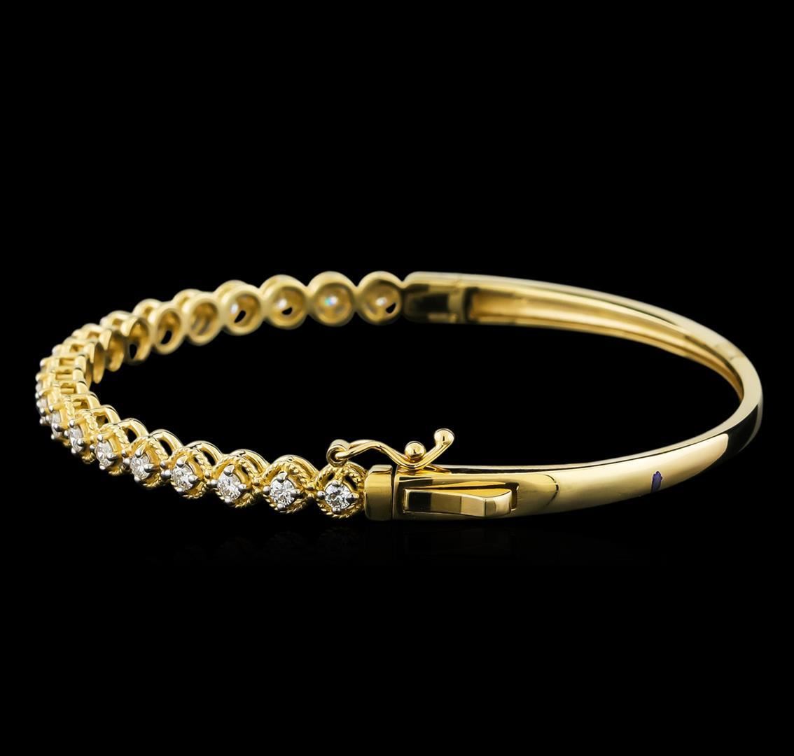 One electronically tested 14KT yellow gold lady's combination cast & assembled fashion bracelet with a tongue clasp with foldover safety with a bright polish finish. The featured lady's bracelet has a circumference of approximately 7 inches. Identified with markings of "K14". Condition is new, good workmanship. Containing: Twenty prong set round brilliant cut diamonds, measuring 2.20 - 2.10 x 1.33mm (depth est.) approximate total weight of 20 Stones = 0.75ct. Graded in the setting. Clarity: SI-1 to SI-2. Color: H - I. Cut Good. Total Weight of Diamonds 0.75ct. Total Weight of Bracelet 11.00gm. GAS Appraised.