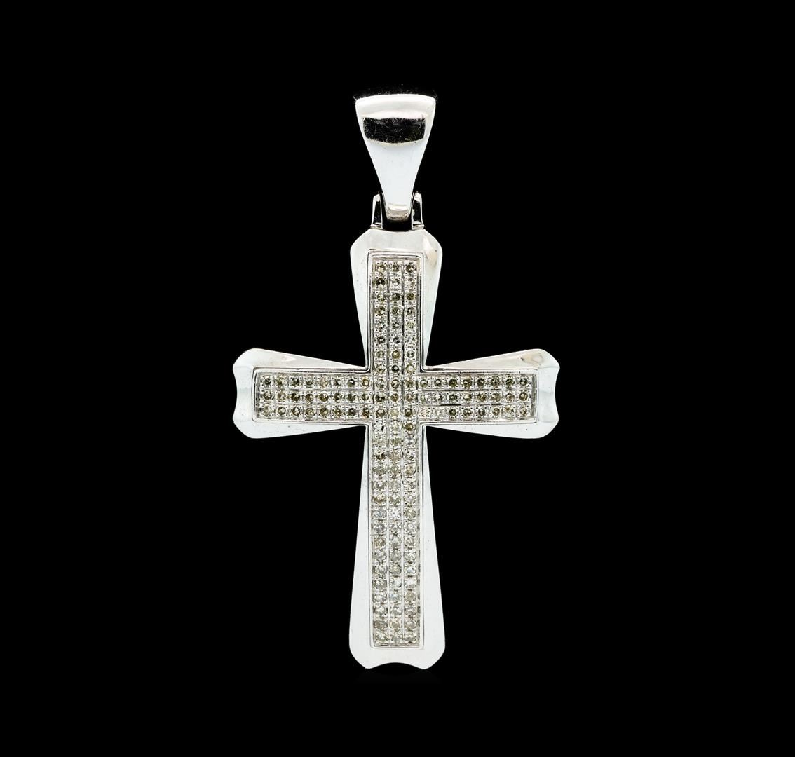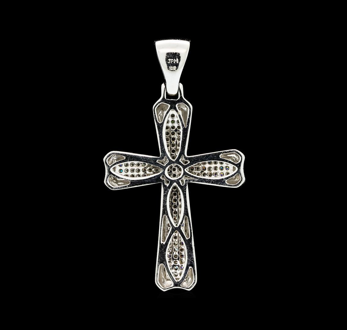 One electronically tested 10KT white gold lady's combination cast & assembled cross pendant with a bright polish finish. Identified with markings of '10K'. Condition is new, good workmanship. Containing: One Hundred Twenty-Nine prong set single cut diamonds, measuring 1.20 - 1.10 x 0.71mm (depth est.) approximate total weight of 129 Stones = 0.75ct. Graded in the setting. Clarity SI-1 to SI-2. Color: I - J Cut Good. Total Weight of Diamonds 0.75ct.. Total Weight of Pendant 11.50gm. Measures approximately 1.5 inches wide and 1 inch high. GAS Appraised.