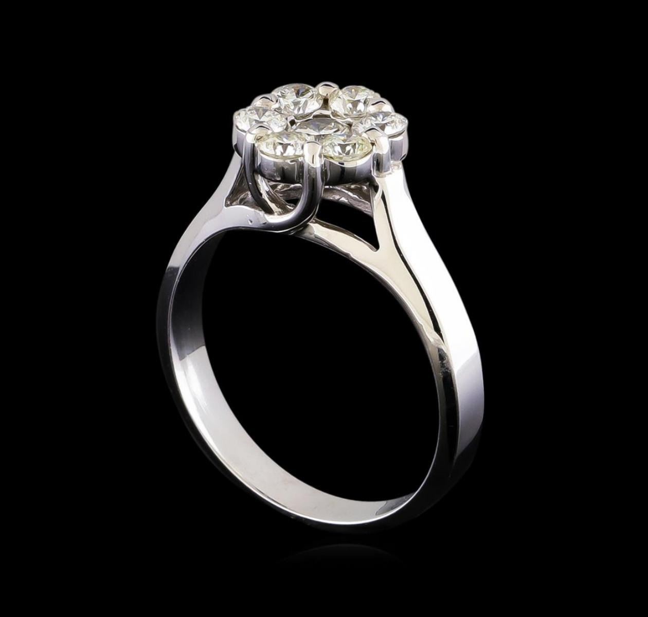 One electronically tested 14KT white gold ladies cast diamond cluster ring with a bright polish finish. The ring features a diamond floret cluster supported by tapering shoulders, completed by a two and one-half millimeter wide band. Identified with markings of "14K". Condition is new, good workmanship. Containing: One prong set round brilliant cut diamond, measuring 3.90 - 3.80 x 2.31mm (depth est.) approximate weight of 0.22ct. Graded in the setting. Clarity: I-1. Color: G Six prong set round brilliant cut diamonds, measuring 2.85 - 2.80 x 1.70mm (depth est.) approximate total weight of 6 Stones = 0.53ct. Graded in the setting. Clarity: SI-1 to SI-2. Color: H - J. Total Weight of Diamonds 0.75ct. Total Weight of Ring 3.71gm. AIG Appraised at $2,980.00.