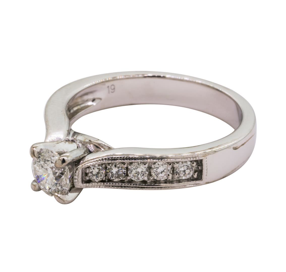 One lady's ring with a straight line cathedral motif with milgrain detailing featuring: 14KT white gold weighing 4.5 grams containing diamonds weighing 0.75ctw.
