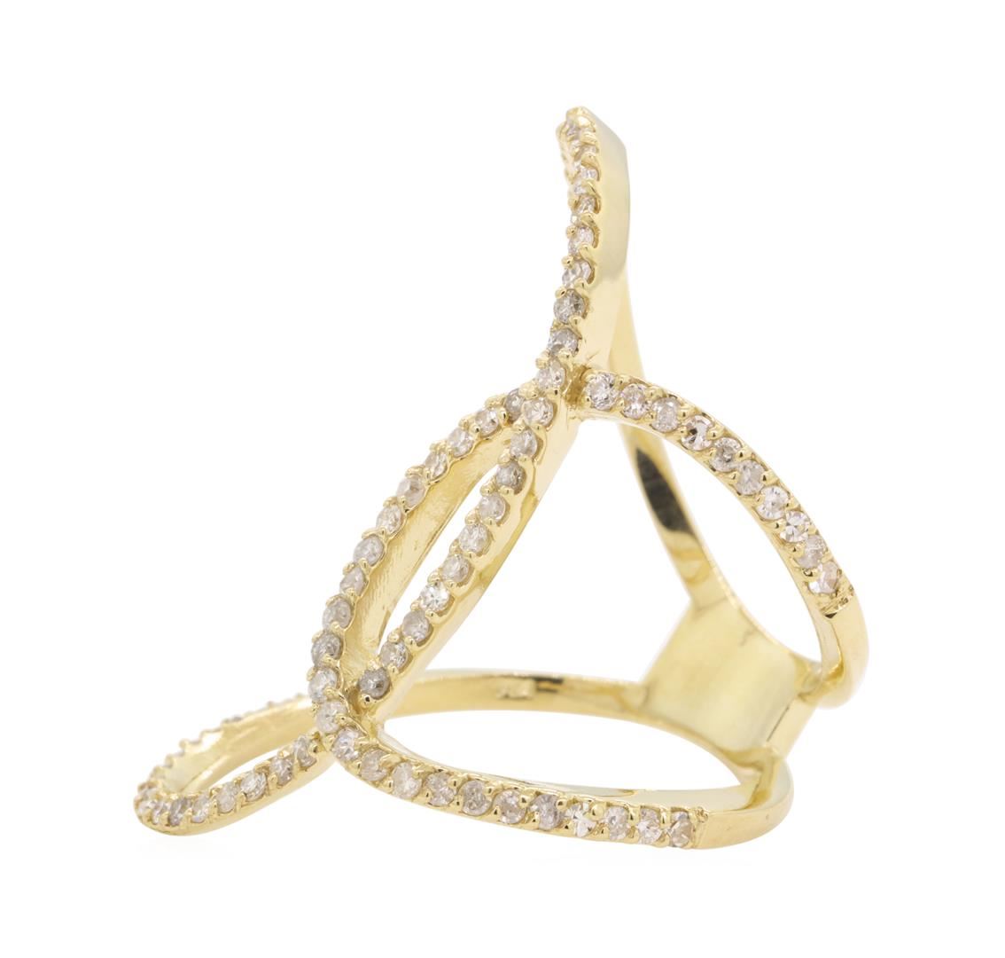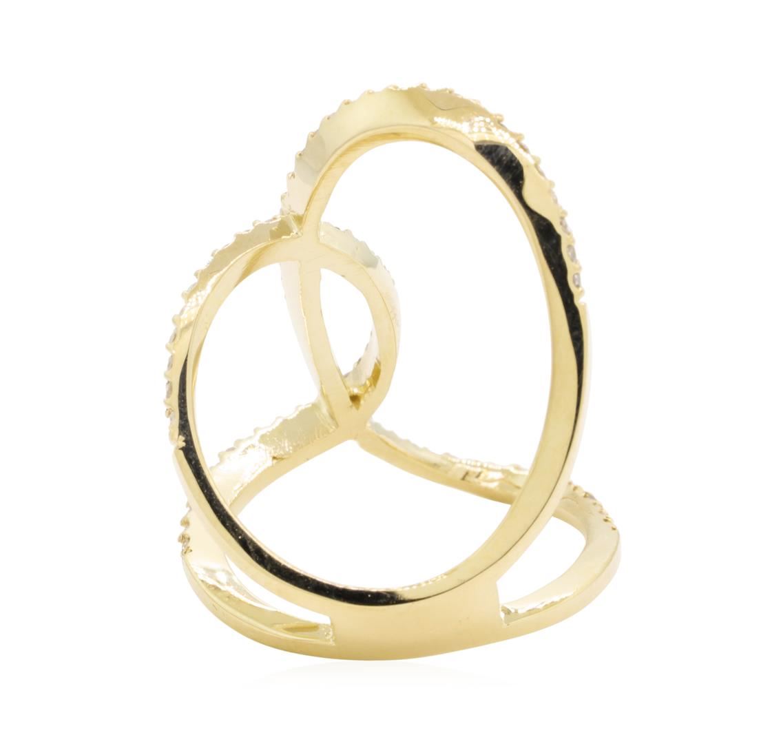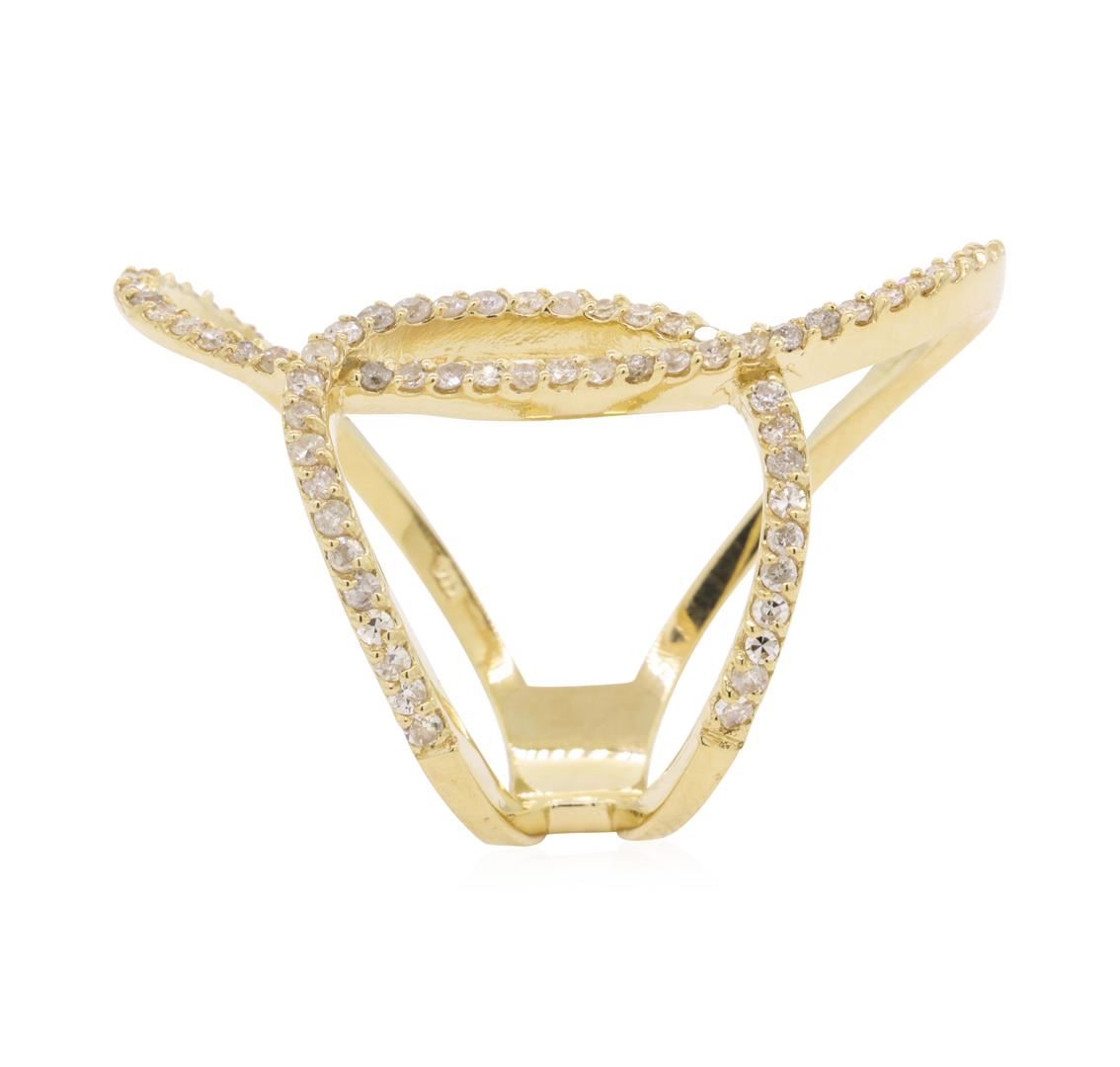 One electronically tested 14KT yellow gold lady's cast fashion ring with a free form spiral with a bright polish finish. This featured lady's ring has a shank measuring 5.10 millimeters in width. Identified with markings of '14K'. Condition is new, good workmanship. Containing: Seventy-Nine prong set single cut diamonds, measuring 1.40 - 1.30 x 0.84mm (depth est.) approximate total weight of 79 Stones = 0.75ct. Graded in the setting. Color H - J Clarity SI-2 to I-1 Cut Good. Total Weight of Diamonds 0.75ct.. Total Weight of Ring 5.20gm GAS Appraised at $2095.00. GAS Appraised.