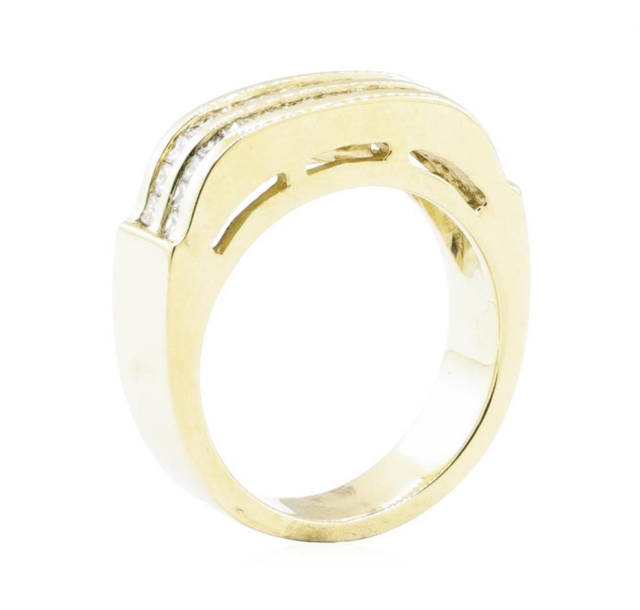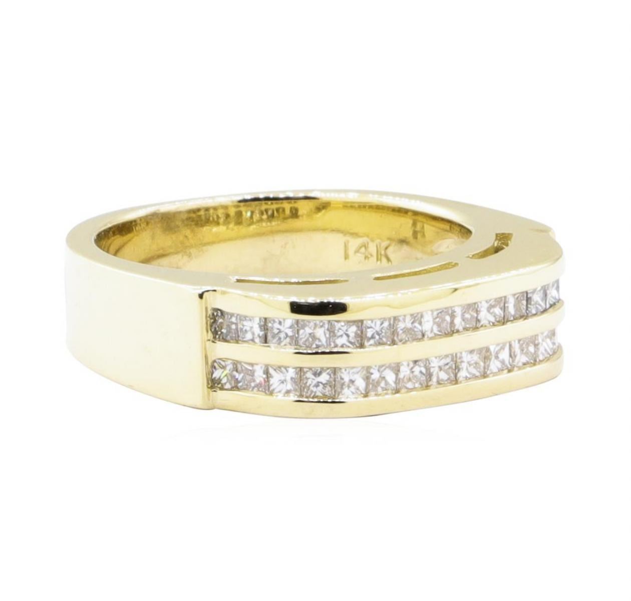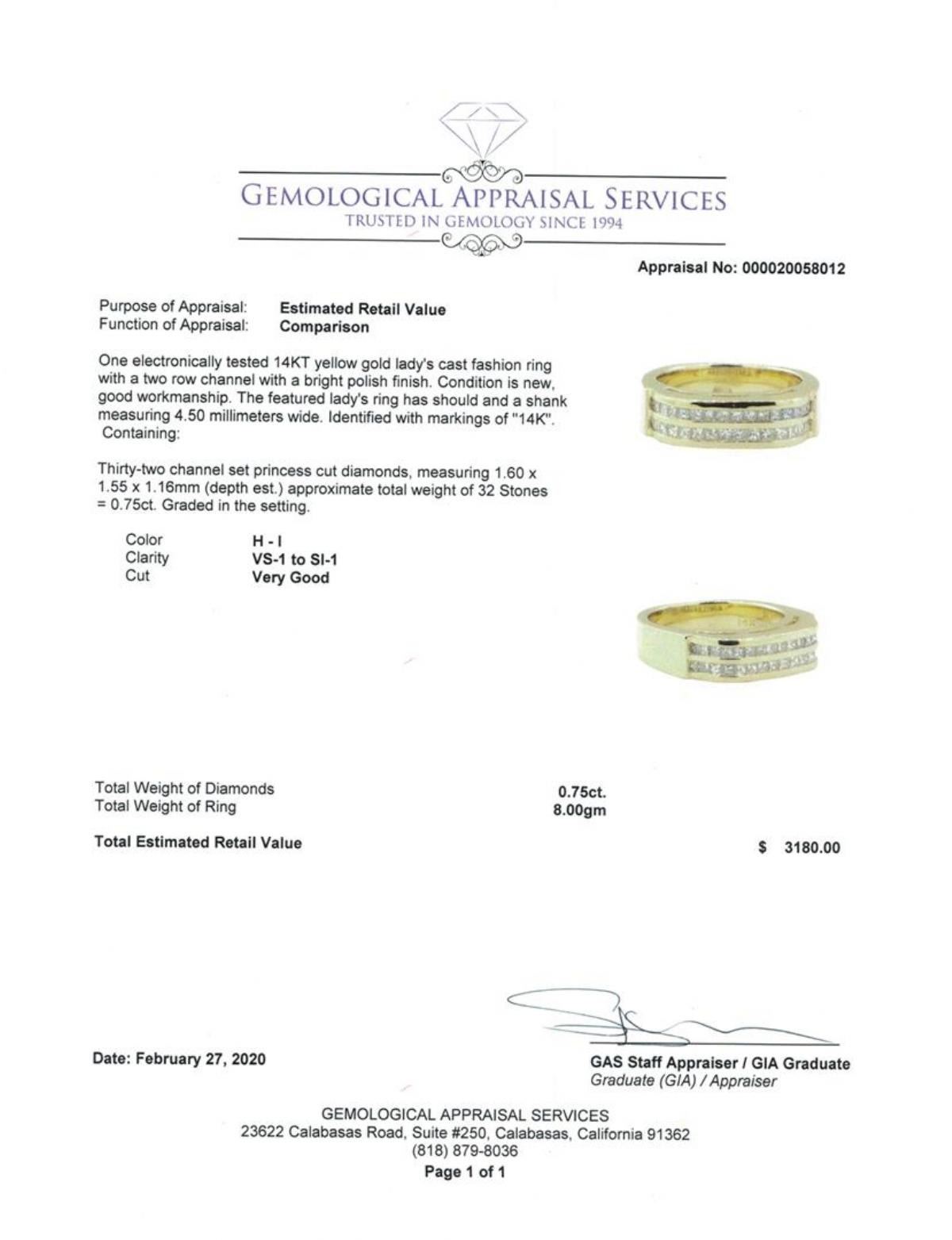 One electronically tested 14KT yellow gold lady's cast fashion ring with a two row channel with a bright polish finish. The featured lady's ring has should and a shank measuring 4.50 millimeters wide. Identified with markings of '14K'. Condition is new, good workmanship. Containing: Thirty-Two channel set princess cut diamonds, measuring 1.60 x 1.55 x 1.16mm (depth est.) approximate total weight of 32 Stones = 0.75ct. Graded in the setting. Color H - I Clarity VS-1 to SI-1 Cut Very Good. Total Weight of Diamonds 0.75ct.. Total Weight of Ring 8.00gm GAS Appraised at $3180.00. GAS Appraised.