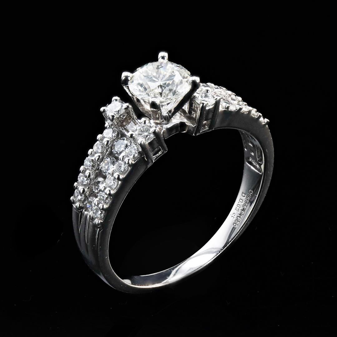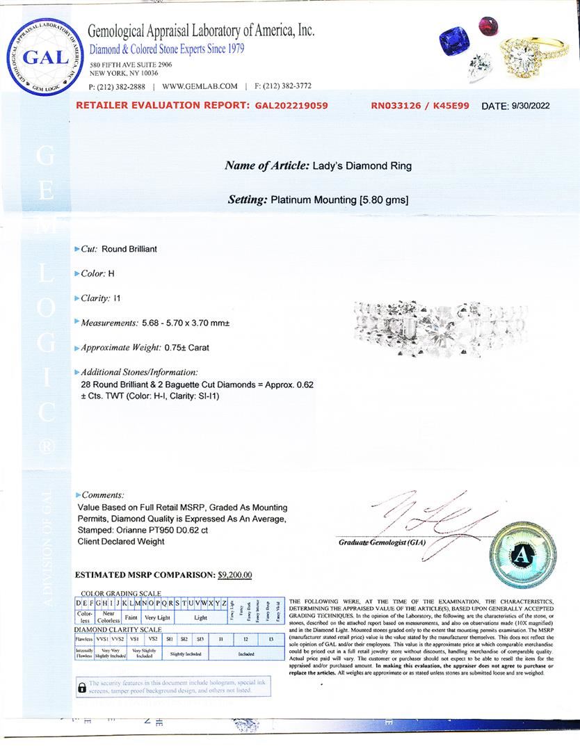 Name of Article: Lady's Diamond Ring Setting: Platinum Mounting [5.80 gms] Cut: Round Brilliant Color: H Clarity: I1 Measurements: 5.68 - 5.70 x 3.70mm Approximate Weight: 0.75 Carat Additional Stones/Information: 28 Round Brilliant and 2 Baguette Cut Diamonds = Approx. 0.62 Cts. TWT (Color: H-I, Clarity: SI-I1)